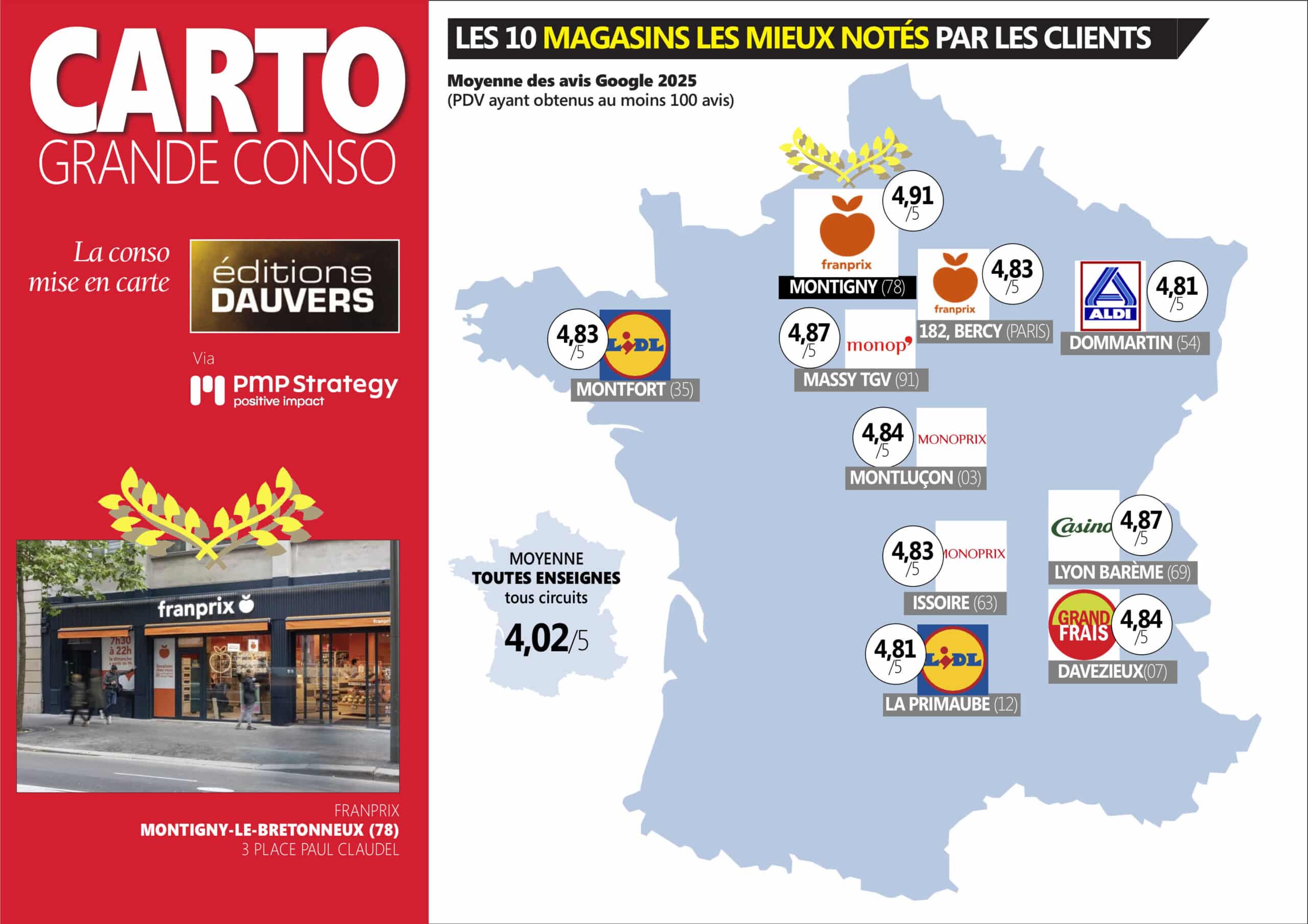 Démarrage de cette série d’infographies bilan 2025 avec les 10 magasins les mieux notés (pour l’alimentaire). Et, tout en haut, du palmarès, le p’tit Franprix de Montigny-le-Bretonneux. 4,91 sur 5, on frôle donc la perfection (promis, je vous le présente bientôt). Un autre Franprix pointe dans le Top 10 : Bercy (au 182 rue de Bercy). D’autant plus méritoire que la proximité urbaine est généralement mal notée, principalement parce que difficile “à tenir”.