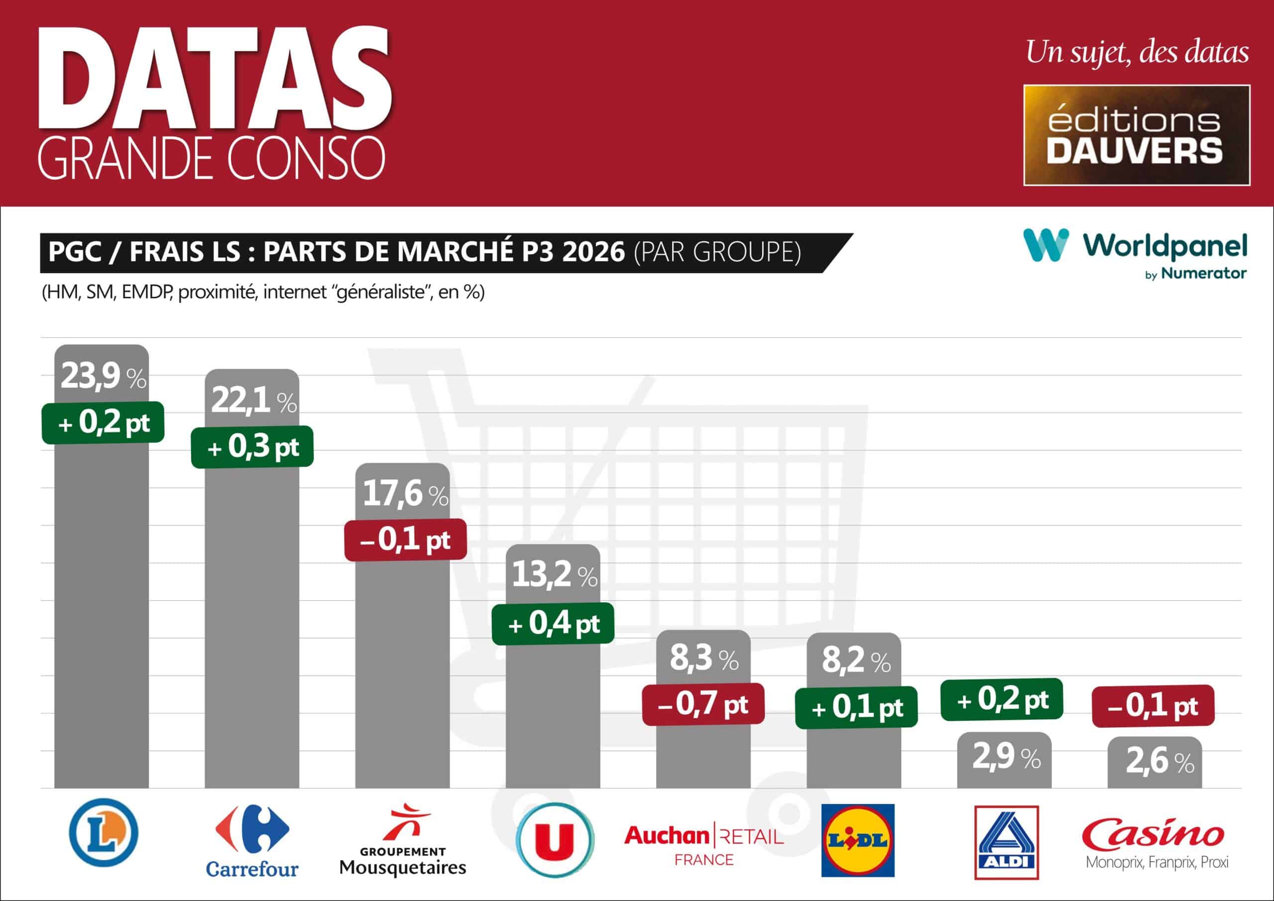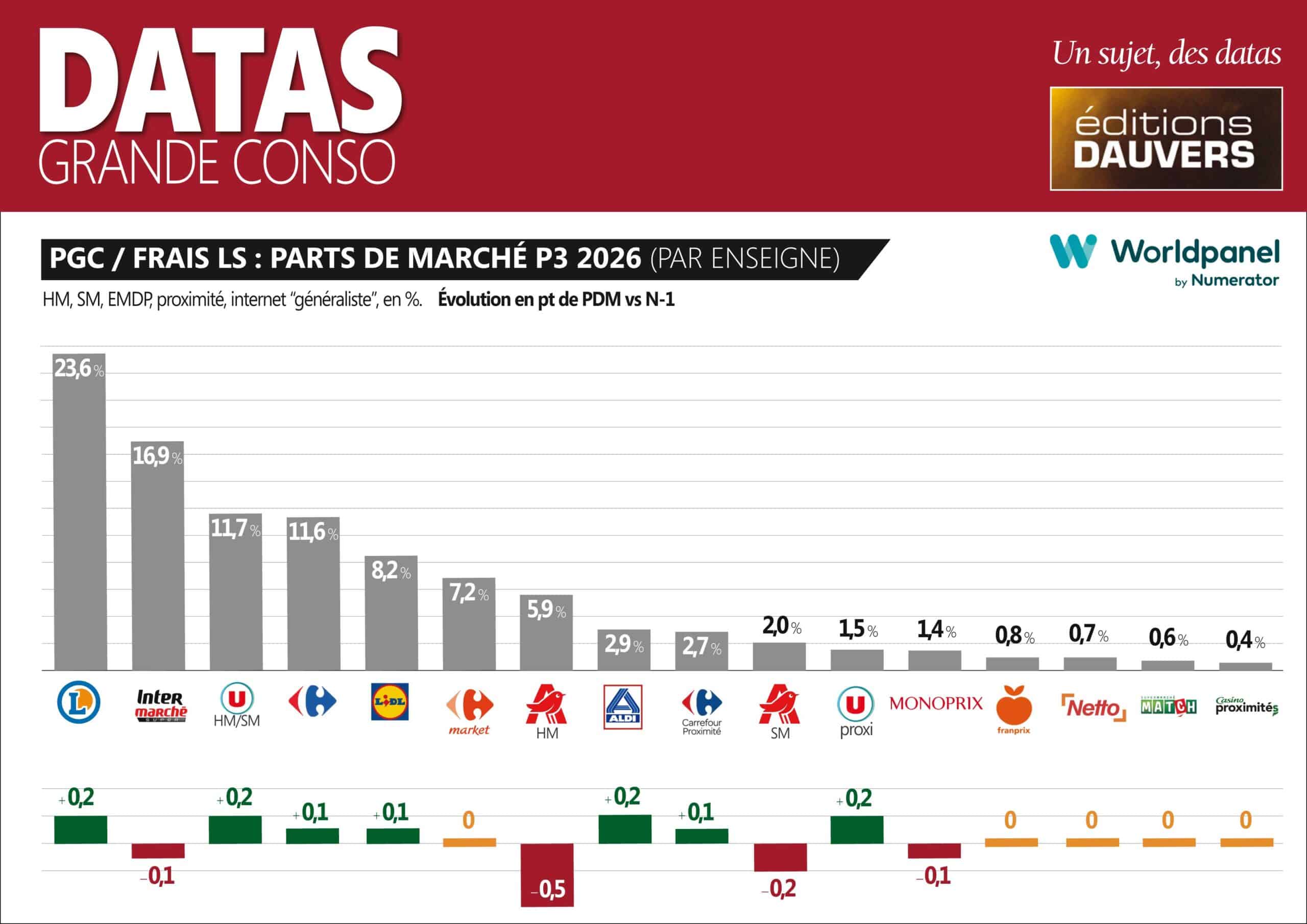 Également au rang des gagnants : Leclerc, U et Aldi. Mais l’analyse diffère suivant les situations. A + 0,4 pt, les U sont dans leur tempo normal, eu égard aux ralliements et acquisitions. Rien de plus, rien de moins. En revanche, pour Aldi et Leclerc, c’est plus méritoire, car sans effet de parc ou presque. Pour Aldi, c’est – en proportion – une progression notable. Pour Leclerc, c’est moins spectaculaire en relatif, sauf si l’on considère qu’il est toujours plus difficile de progresser encore quand on est déjà haut ! Mais Leclerc bénéficie d’un courant d’air porteur… : l’inquiétude des Français pour leur pouvoir d’achat qui dirige mécaniquement les clients vers l’enseigne !
