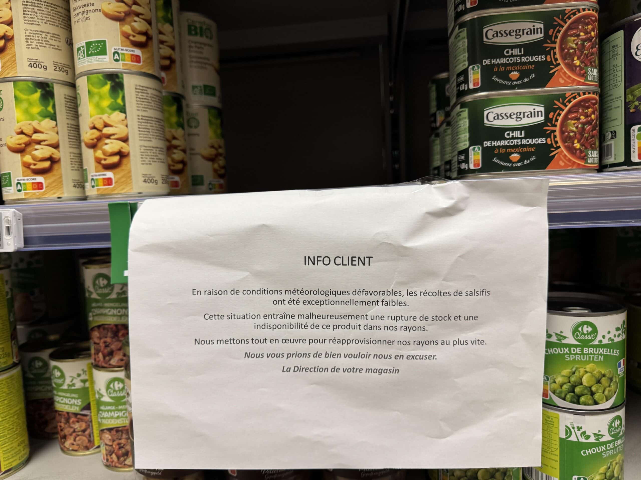 Carrefour Market. «En raison de conditions météorologiques défavorables, les récoltes de salsifis ont été exceptionnellement faibles […] Nous mettons tout en œuvre pour réapprovisionner nos rayons au plus vite ». Vous pressez pas quand même, c’est pas si grave, on peut très bien vivre sans salsifis !