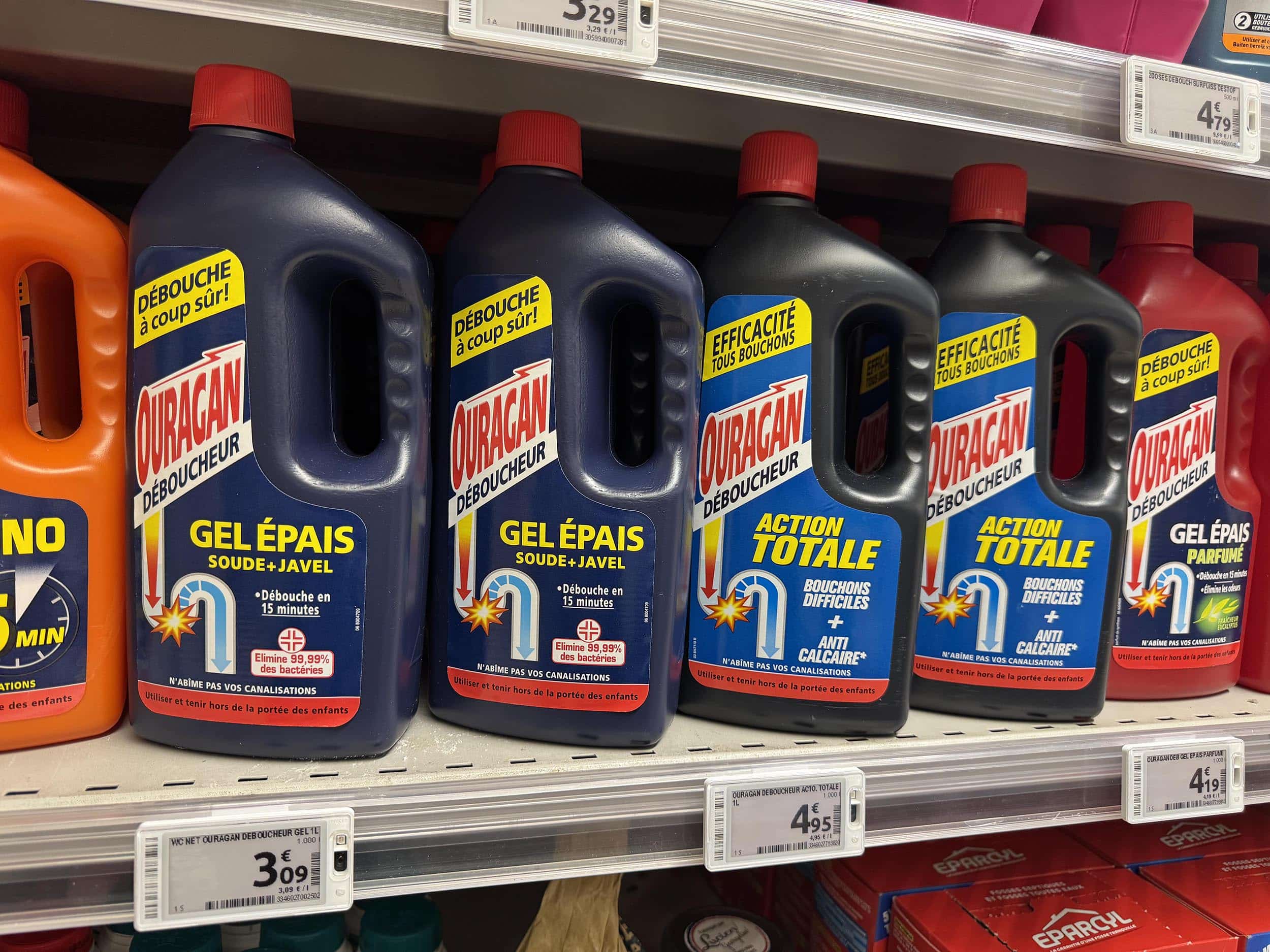 Droguerie. A droite, Ouragan déboucheur « action totale / efficacité tous bouchons » à 4,95 €. A gauche, Ouragan déboucheur « débouche à coup sûr » à 3,09 €. S’il… débouche à coup sûr, pourquoi payer près de 2 € de plus ? #VuduClient (toujours).