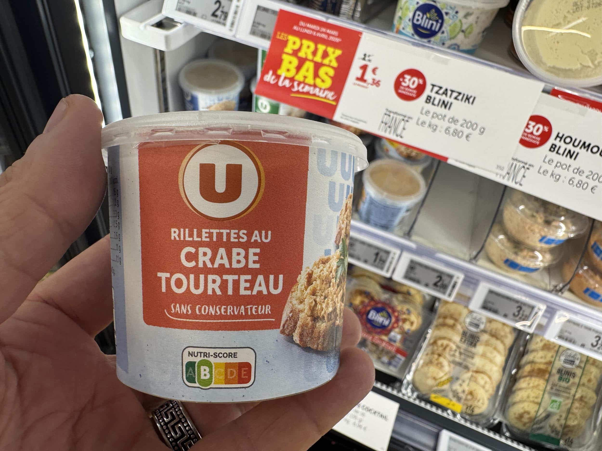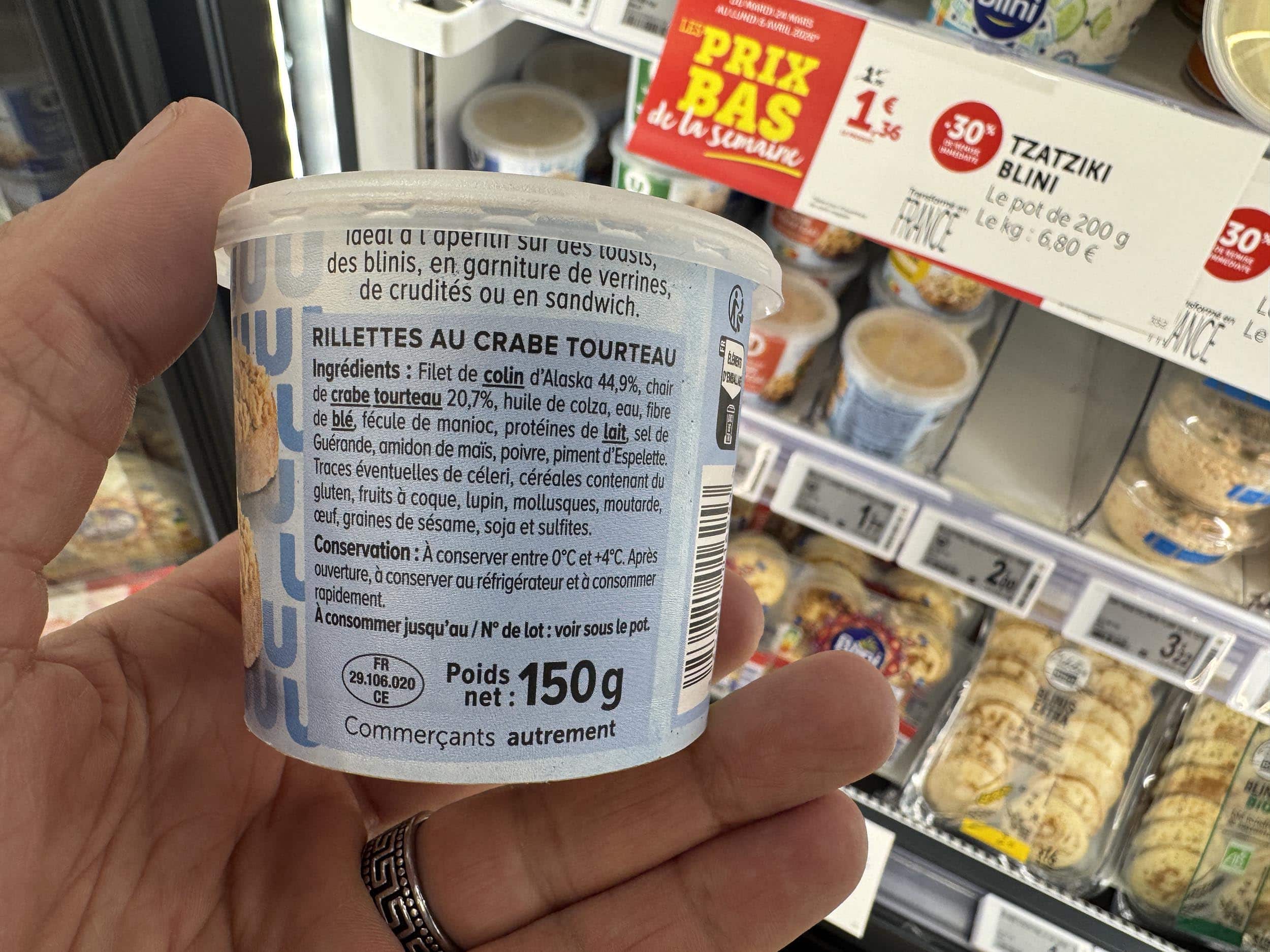 Chez U. « Rillettes au crabe tourteau ». A bien lire, plutôt des rillettes au colin. J’imaginais pourtant les U moins mesquins que la moyenne.