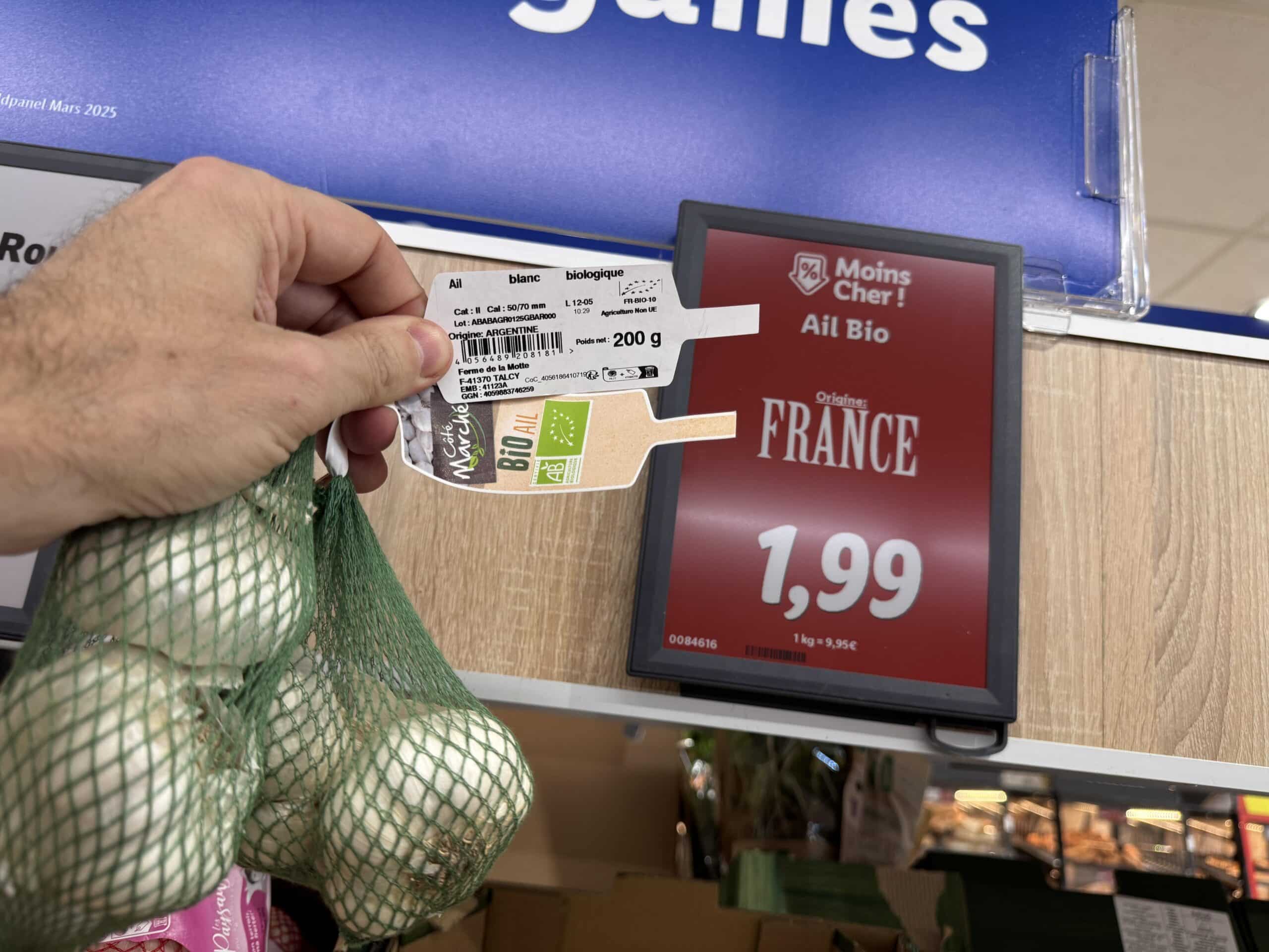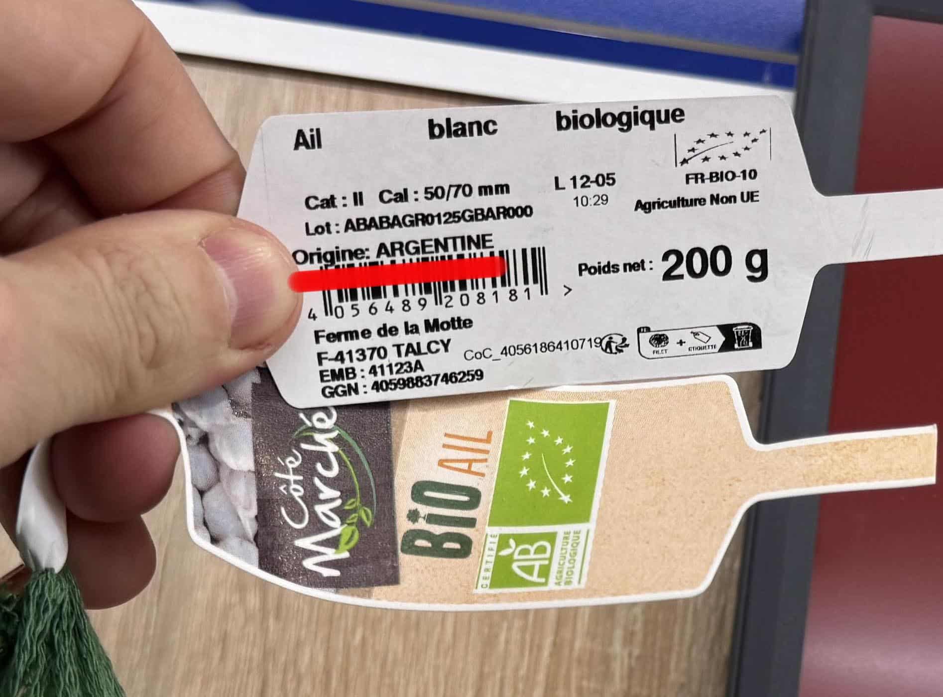 Lidl à Doué la Fontaine. L’ail bio français est argentin. Une erreur, évidemment. Mais l’ail argentin, à l’autre bout du monde, peut-il vraiment encore être « bio » quand il arrive en Anjou ?
