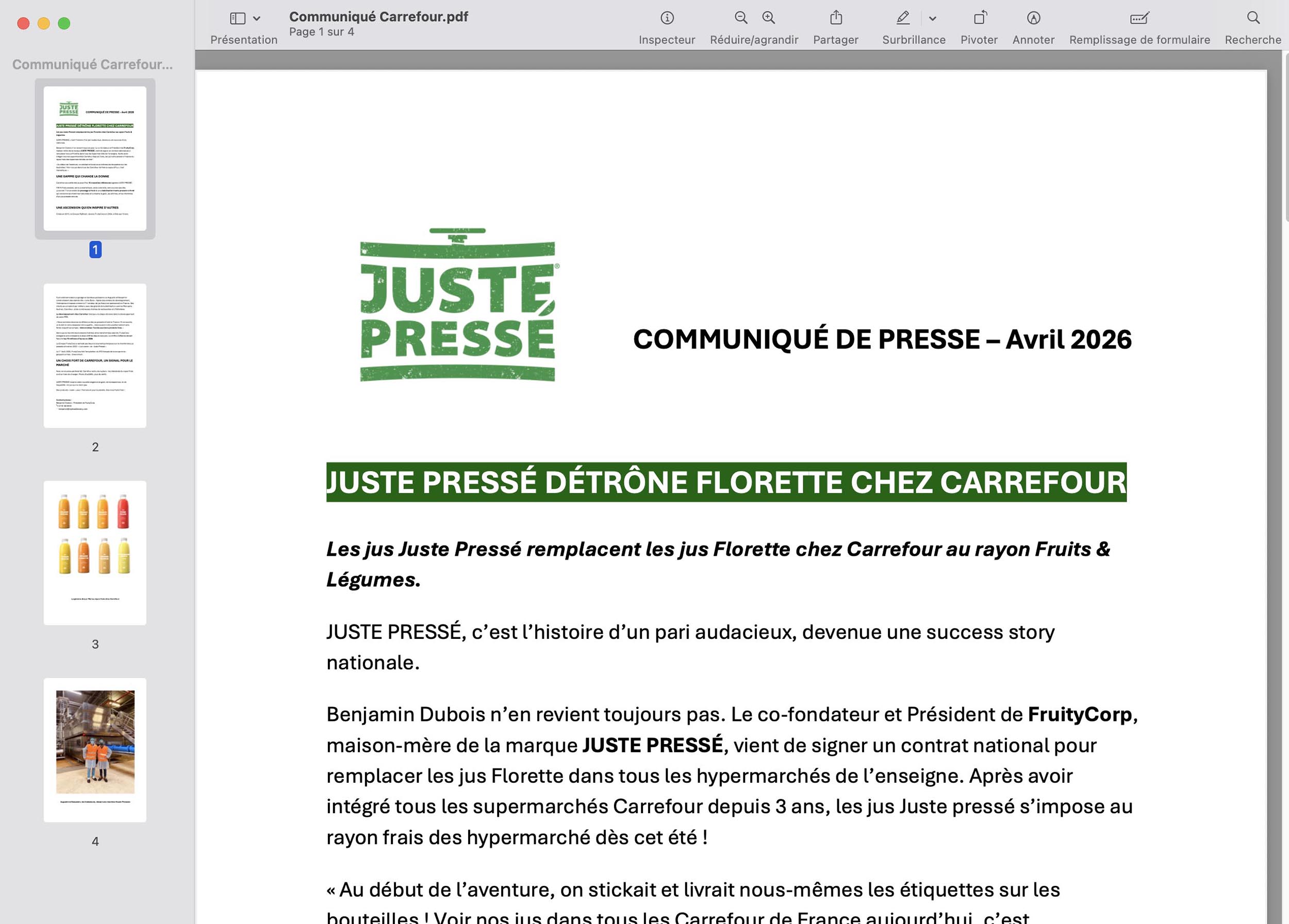 Un communiqué de presse parmi les dizaines reçus tous les jours. Celui-là est savoureux. « Juste Pressé détrône Florette chez Carrefour ». Z’ont du apprécier chez Florette !