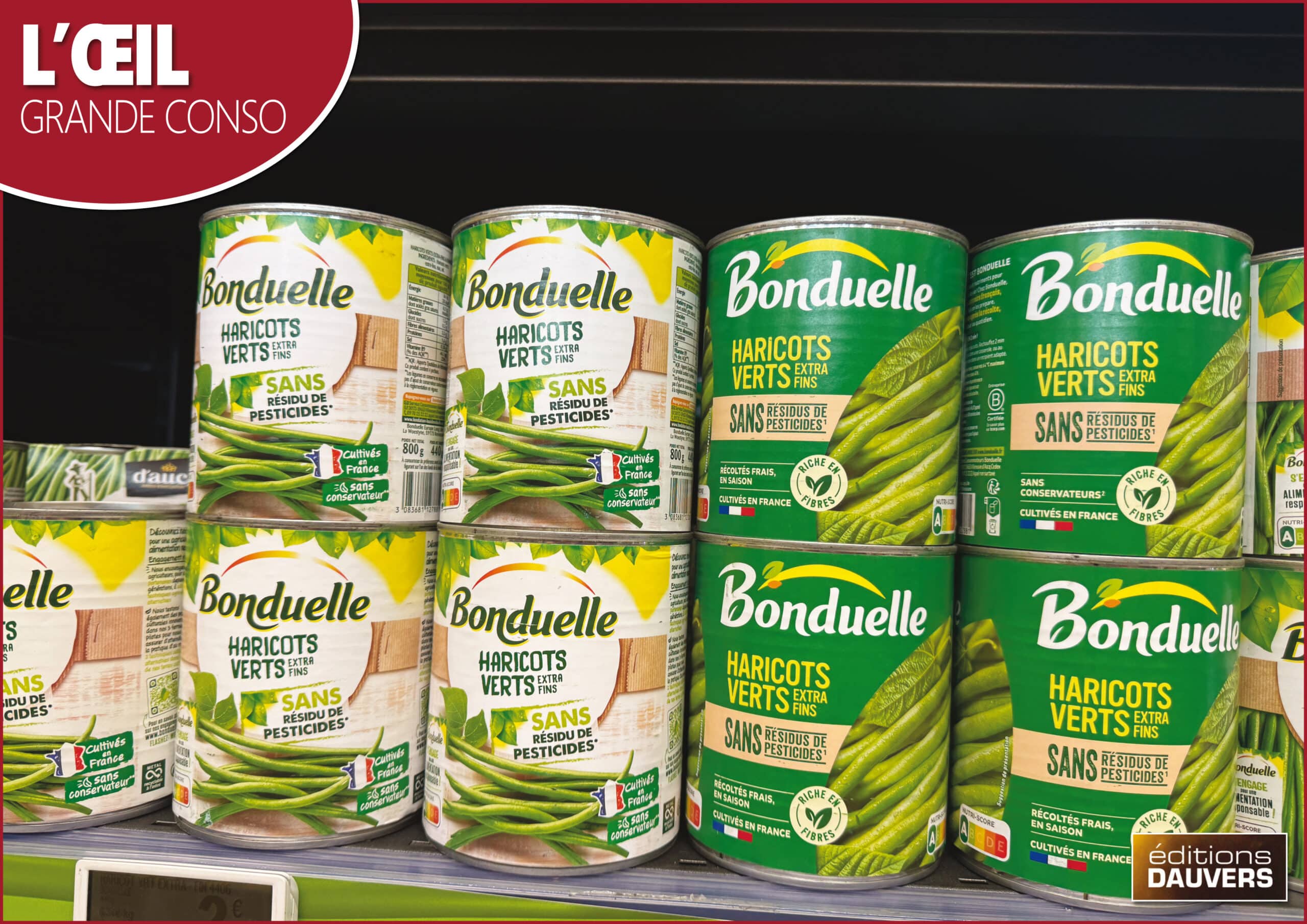 C’est en cours dans les rayons : l’arrivée des nouveaux packs Bonduelle. Et une différence majeure, évidente même. L’impact visuel par l’arrivée d’un aplat de couleur (façon Coca-Cola). Et pas n’importe quelle couleur : le vert. C’est une façon de se l’approprier. Et comme le vert est le symbole du végétal, ça n’est évidemment pas qu’un hasard 😉 Pour les curieux, les profs de marketing ou leurs élèves, j’vous ai préparé un p’tit avant/après.