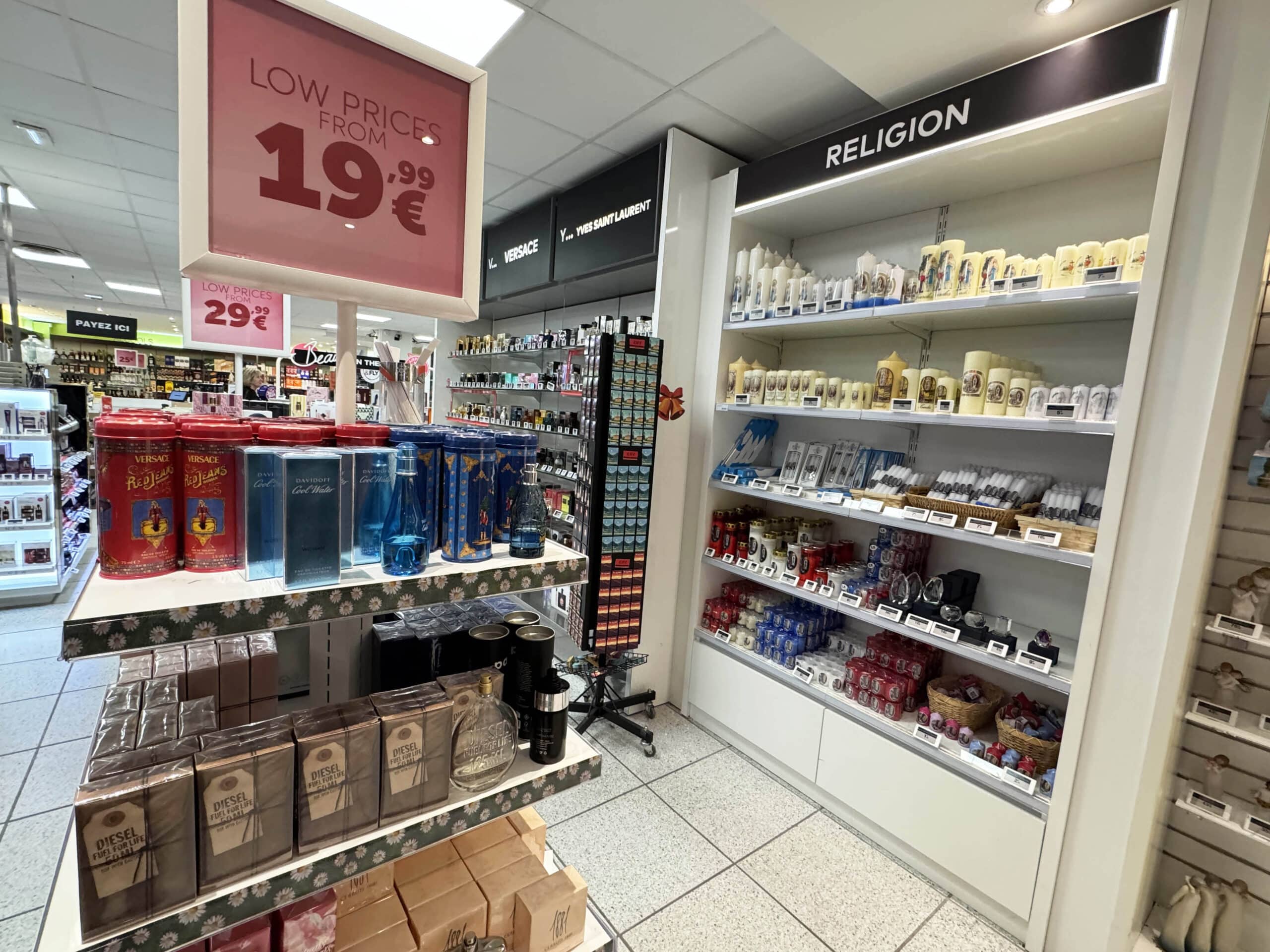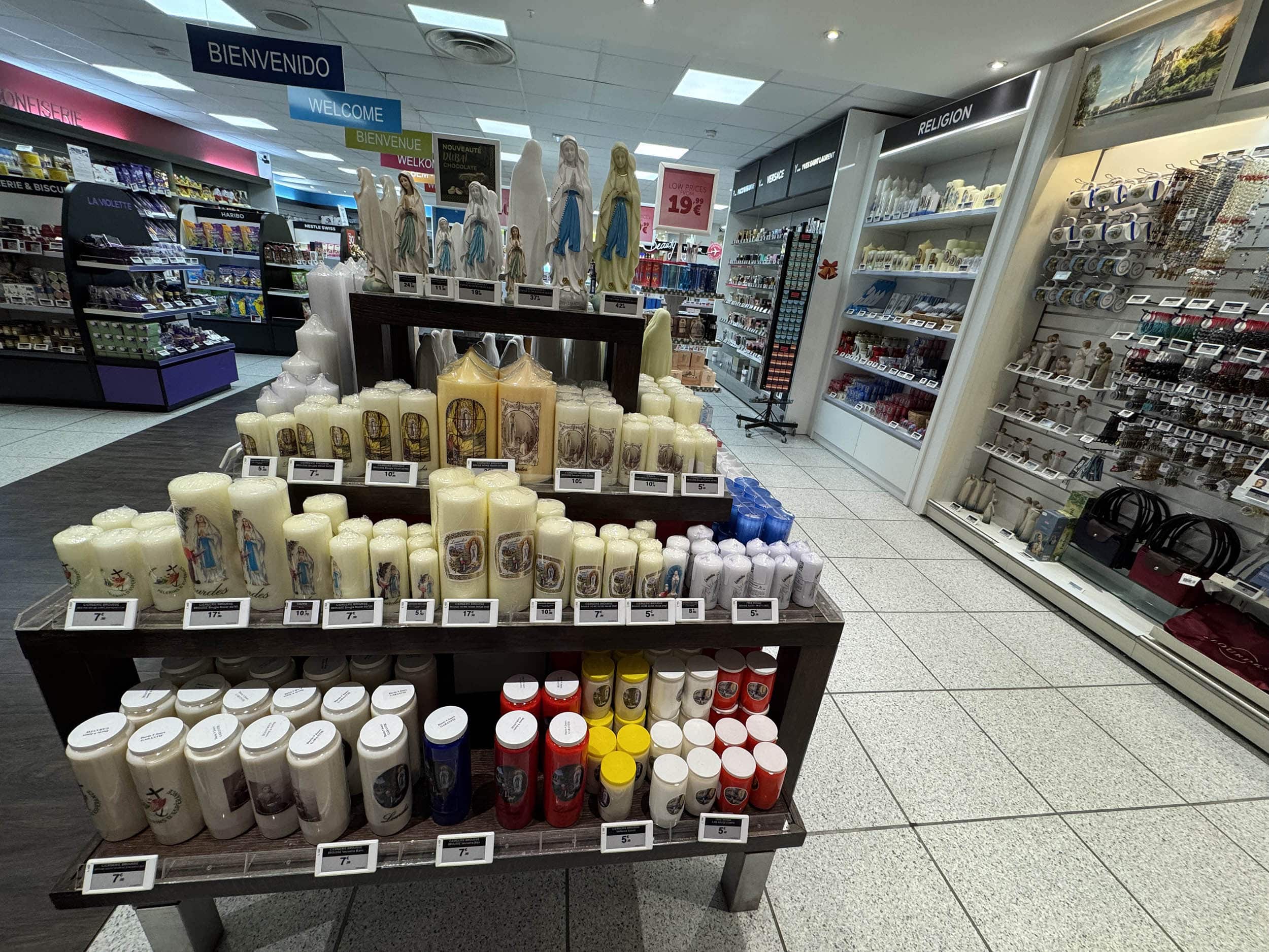 Aéroport de Lourdes. Le duty free inondé de « bondieuseries ». L’adaptation locale 😉.
