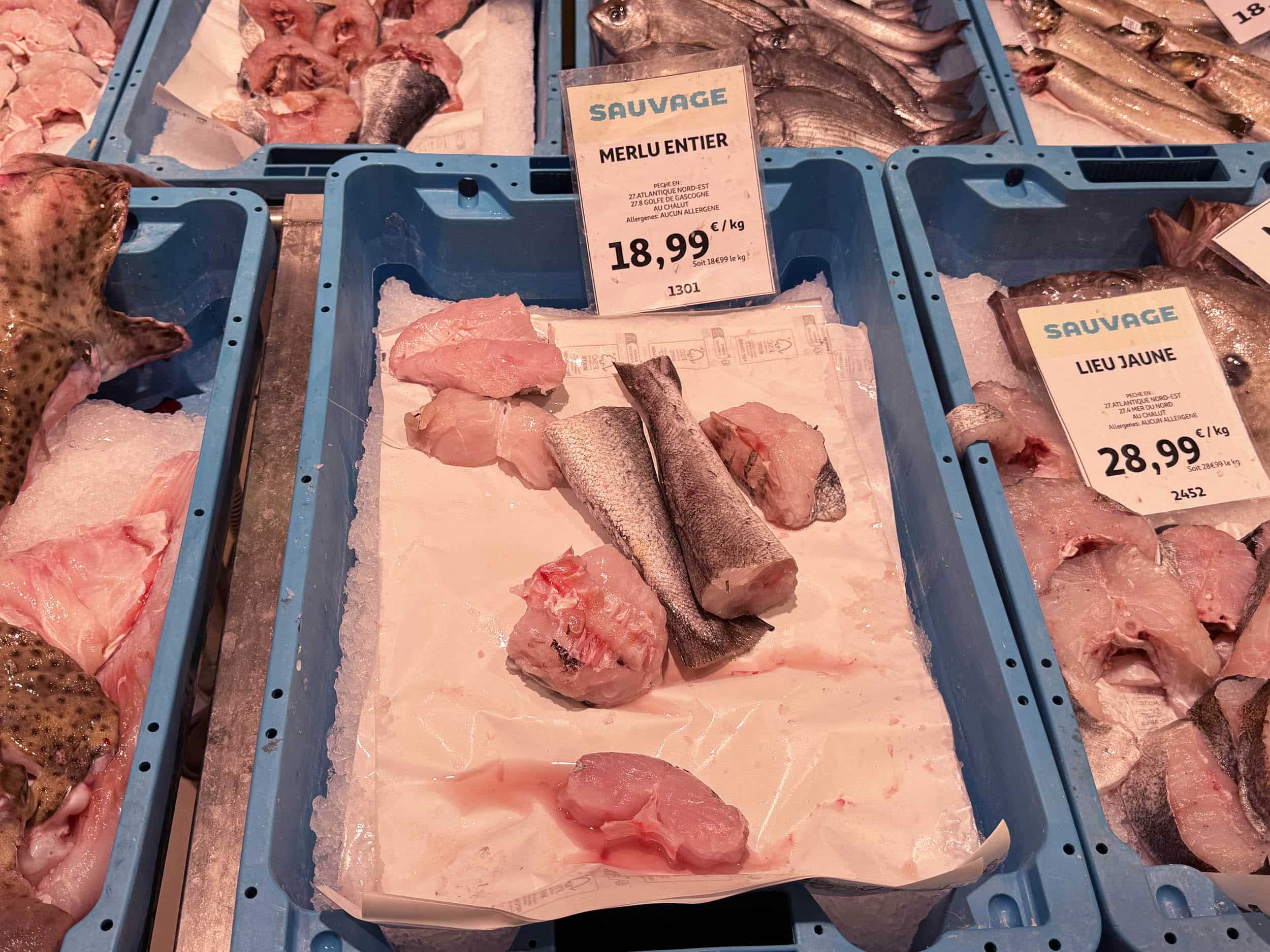 A la poissonnerie. Oui, le merlu a été « entier ». Il ne l’est plus !