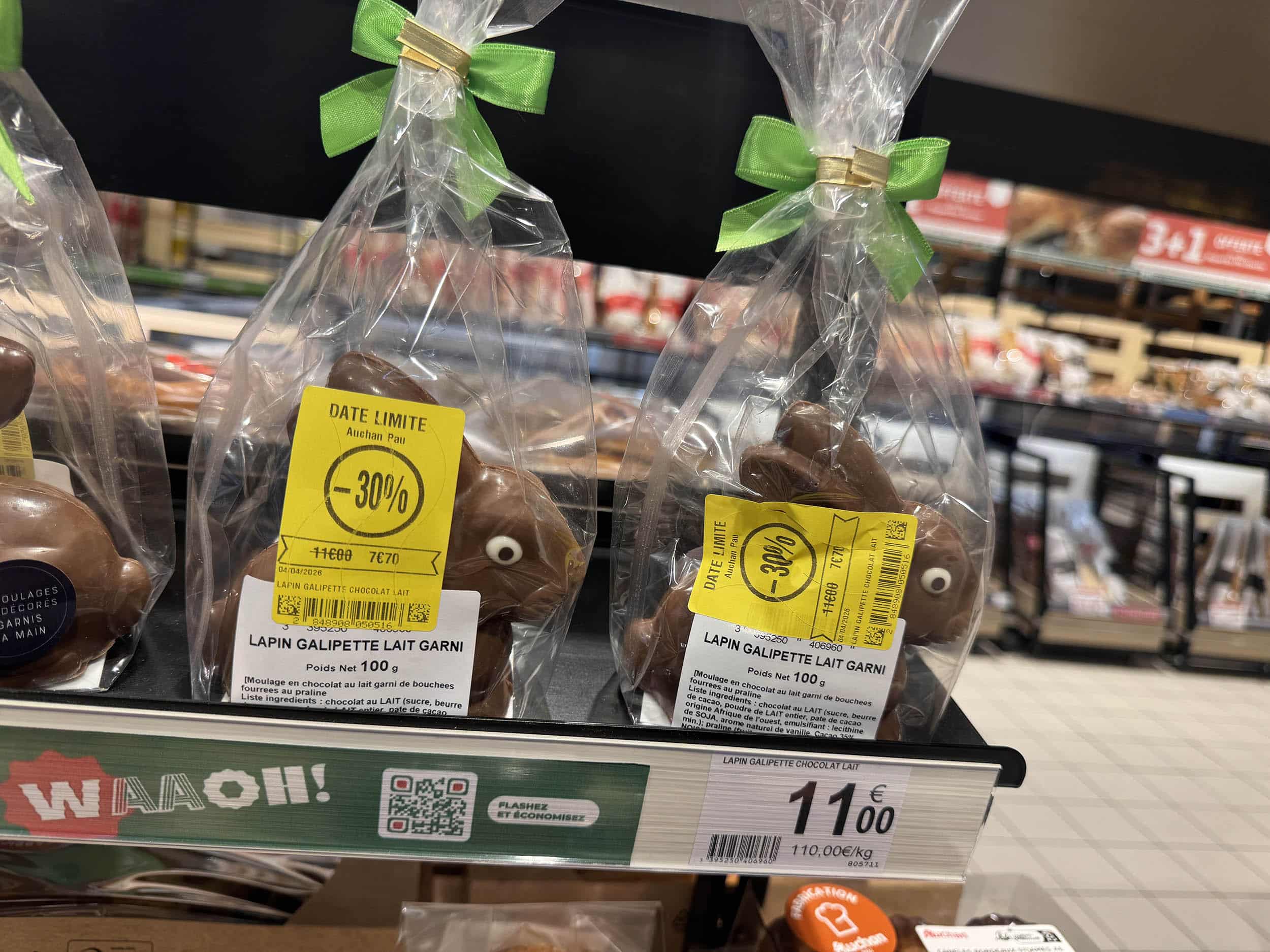 Ici aussi, on brade les chocolats de Pâques. De 110 € à 77 € du kilo ! C’est donné. Ou pas.