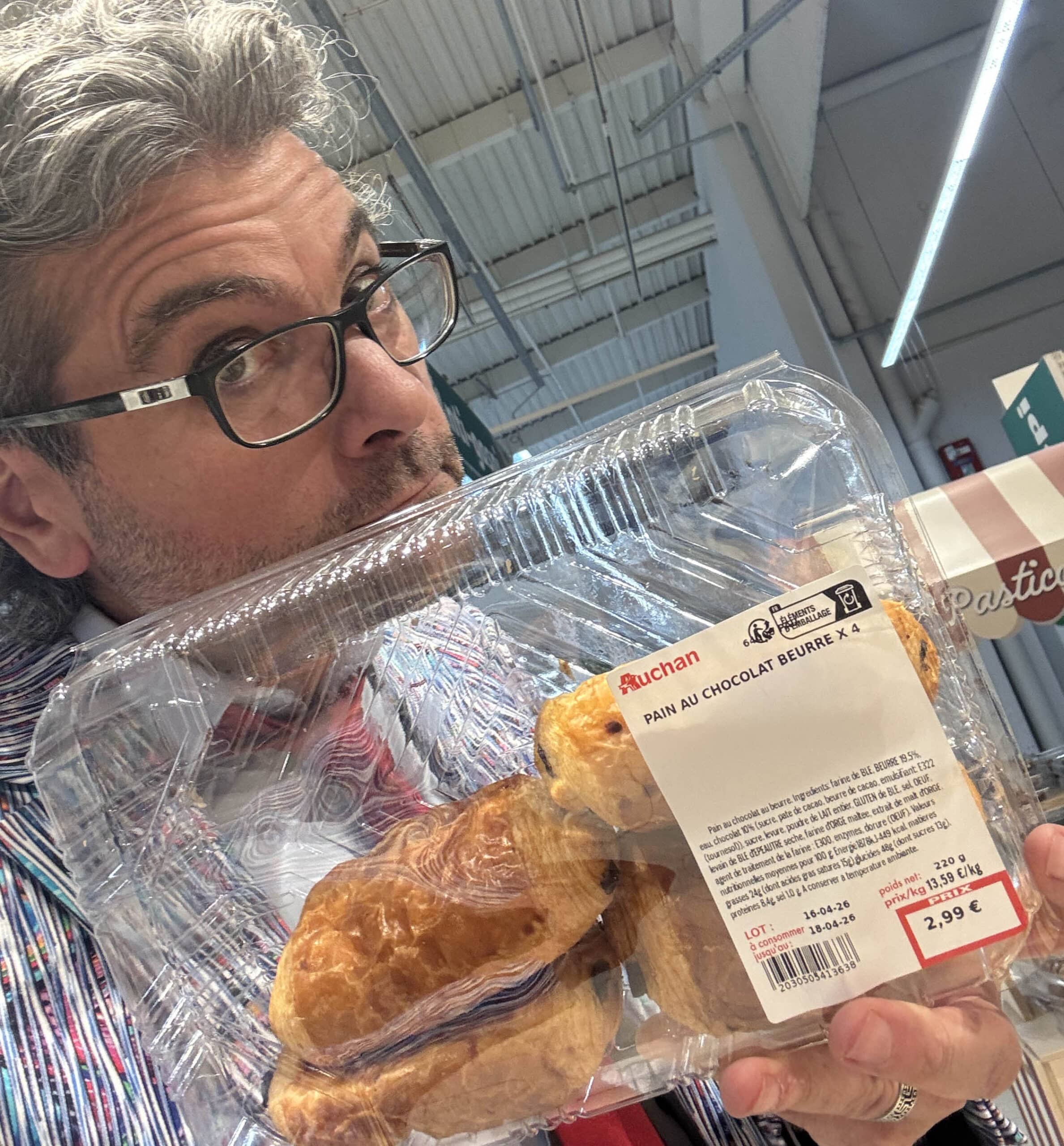 Stores-tour dans le Béarn. Stop à Auchan Pau. « Pain au chocolat » à Pau ??? Vous avez décidé de me fâcher, Auchan??? Pain au chocolat, pffff. Plus sérieusement, le symbole d’une centralisation coupable. Parce que ça coûte quoi de parler la langue de ses clients ? #Chocolatine.
