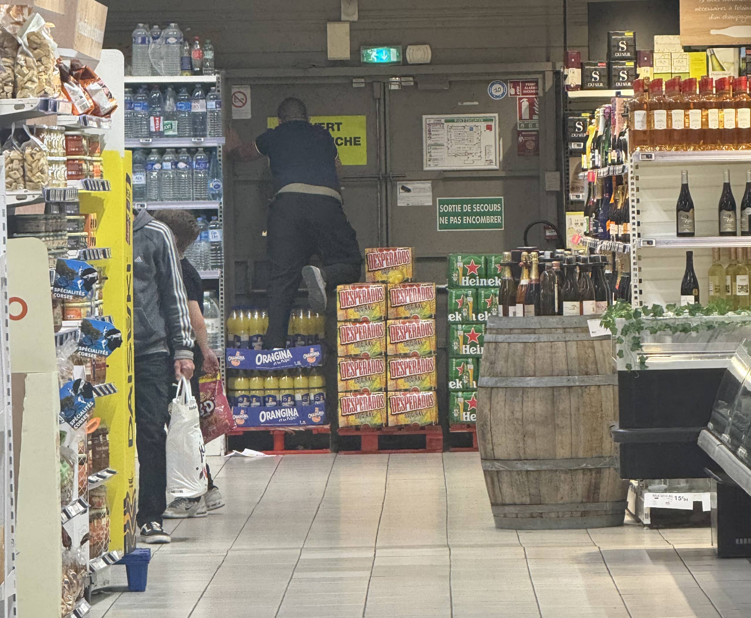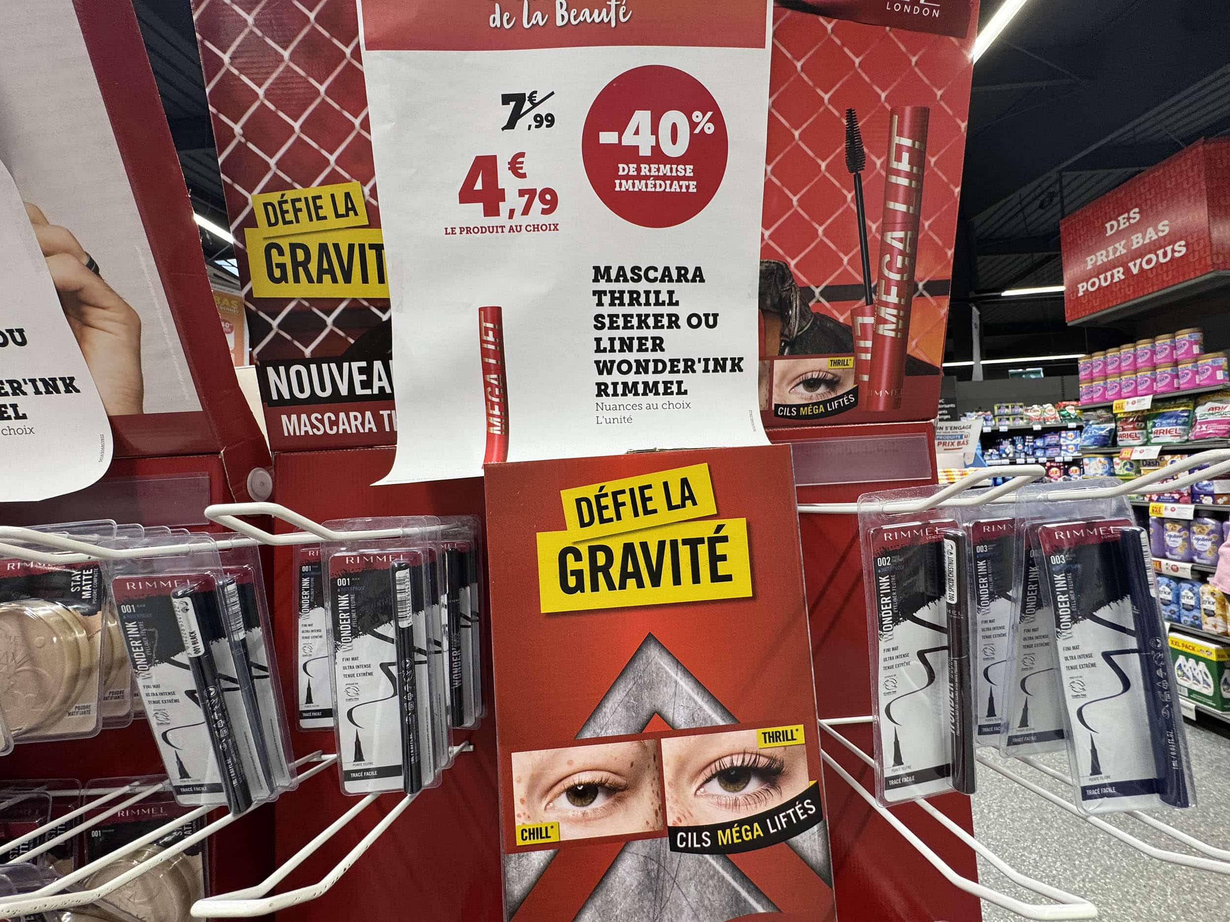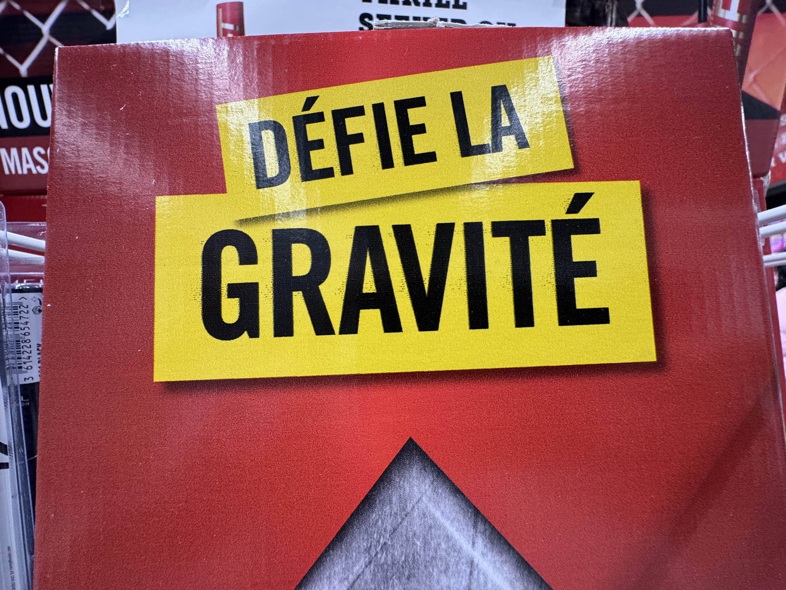 Promos dans l’allée centrale. Et une devinette. « Défie la gravité ». D’après vous, c’est pour quoi ?