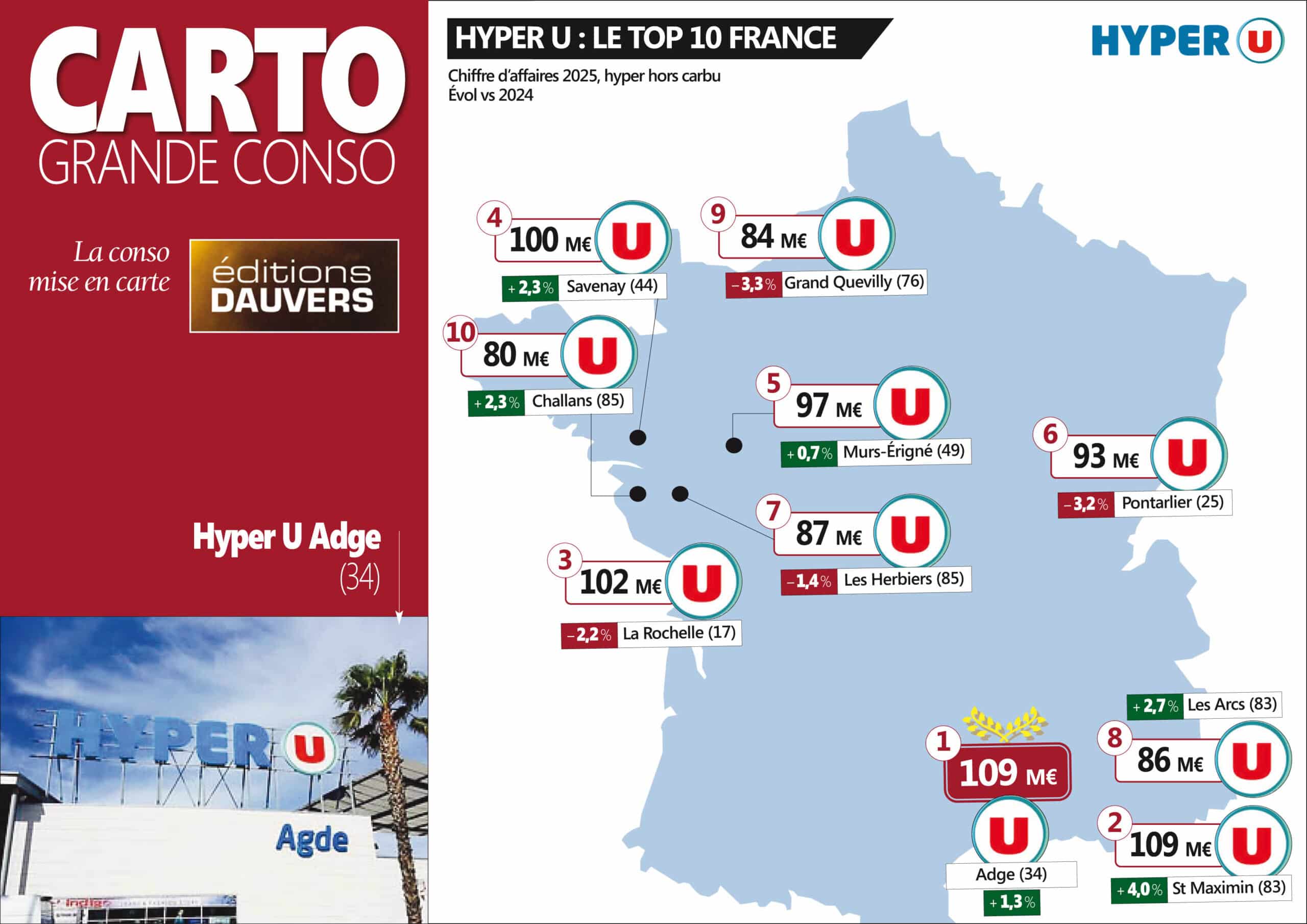 Fallait bien que les U y passent… Après les Top 10 des hypers Auchan, Carrefour et Leclerc, voici donc Hyper U. Et un centre de gravité clairement à l’Ouest ! La moitié du Top 10 est dans un triangle qui va de Nantes à Angers et La Rochelle. Aucune surprise ! L’Ouest est à la fois la région d’origine des U ET la première région de la coopérative en chiffre d’affaires. Pour autant, le duo de tête est plus au Sud, entre Agde et le Var. Pour quelques centaines de milliers d’euros, l’hyper d’Agde (hors activités annexes) devance l’hyper de St Maximim. Mais le dauphin progresse fort… : + 4 % vs + 1,3 % l’an dernier. D’ailleurs, comme pour Leclerc, une majorité d’hypers du Top 10 sont encore en croissance.