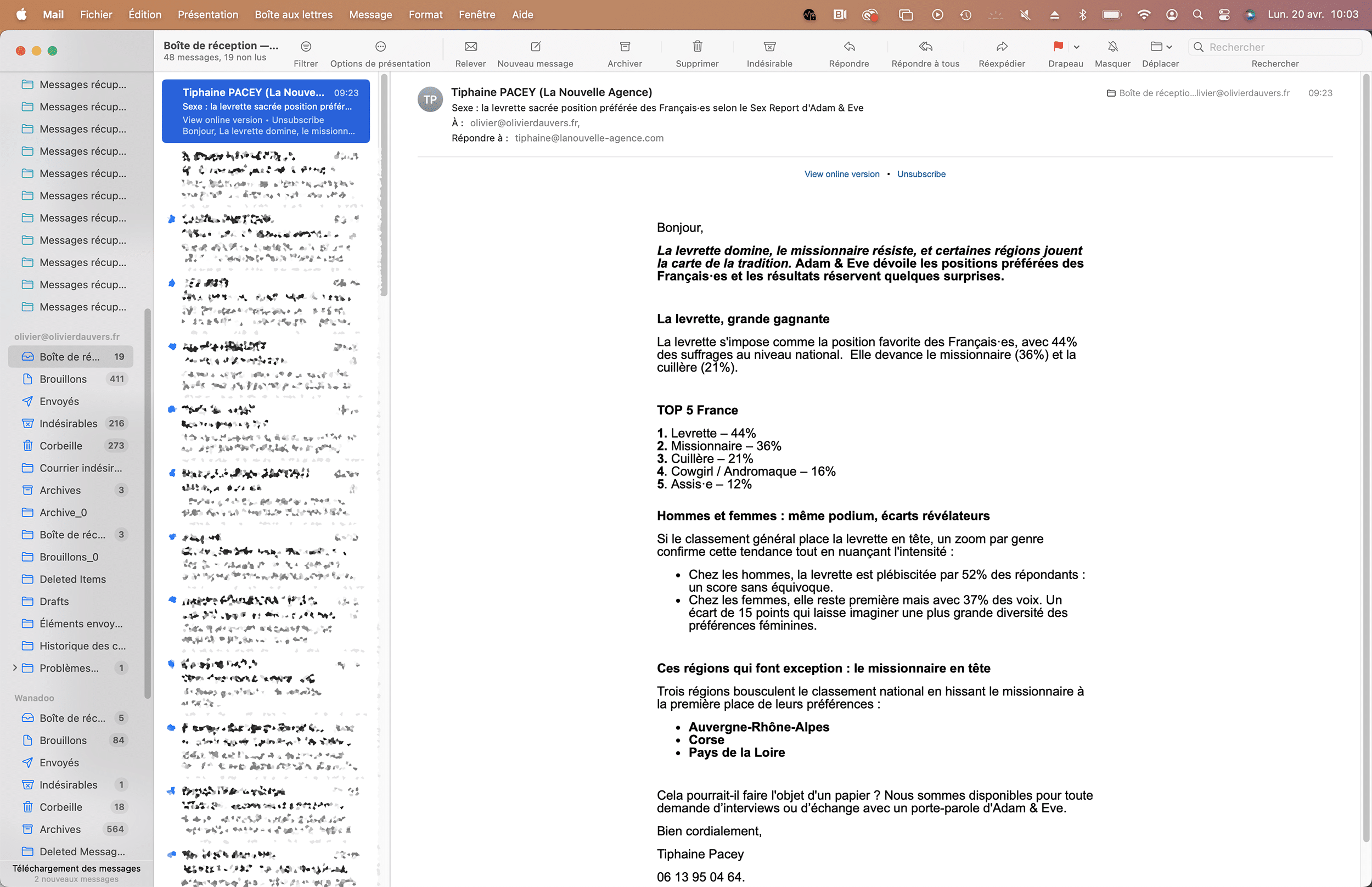 Vis ma vie de journaliste (et les dizaines de communiqués de presse quotidiens, envoyés dans l’espoir d’être repris). Donc, aujourd’hui, une étude d’Adam & Eve (l’enseigne de love stores) nous apprend que la levrette est la position sexuelle préférée des Français (et des Françaises aussi) devant le missionnaire et la cuillère. J’vais quand même pas en faire une infographie du dimanche, si ?