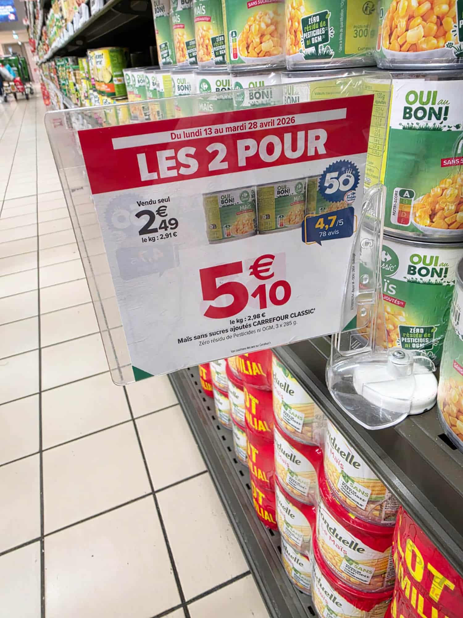 Le maïs chez Carrefour ? 2,49 € la boite ou 5,10 € les deux. Comment dire… ? Je rappelle que les affiches ne sont pas (encore) posées par des robots.