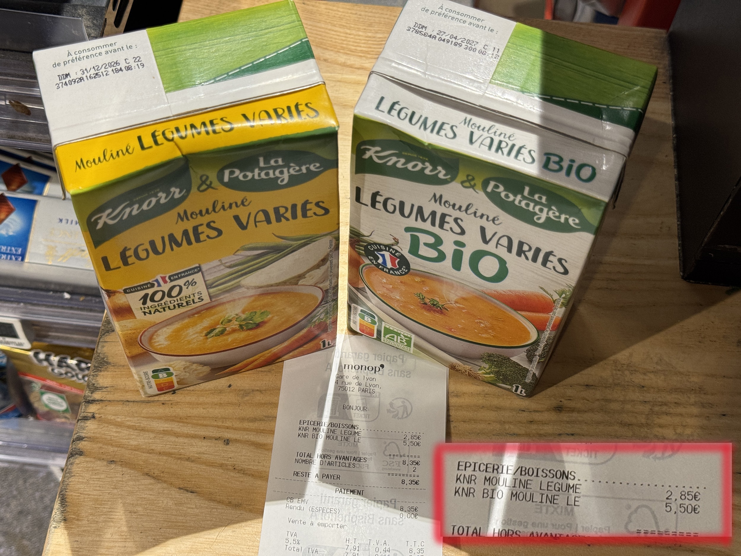 Monop’. Non non, le bio n’est pas si cher. 5,50 € la brique d’un litre de soupe. A comparer à 2,85 € pour la même marque et la même recette.