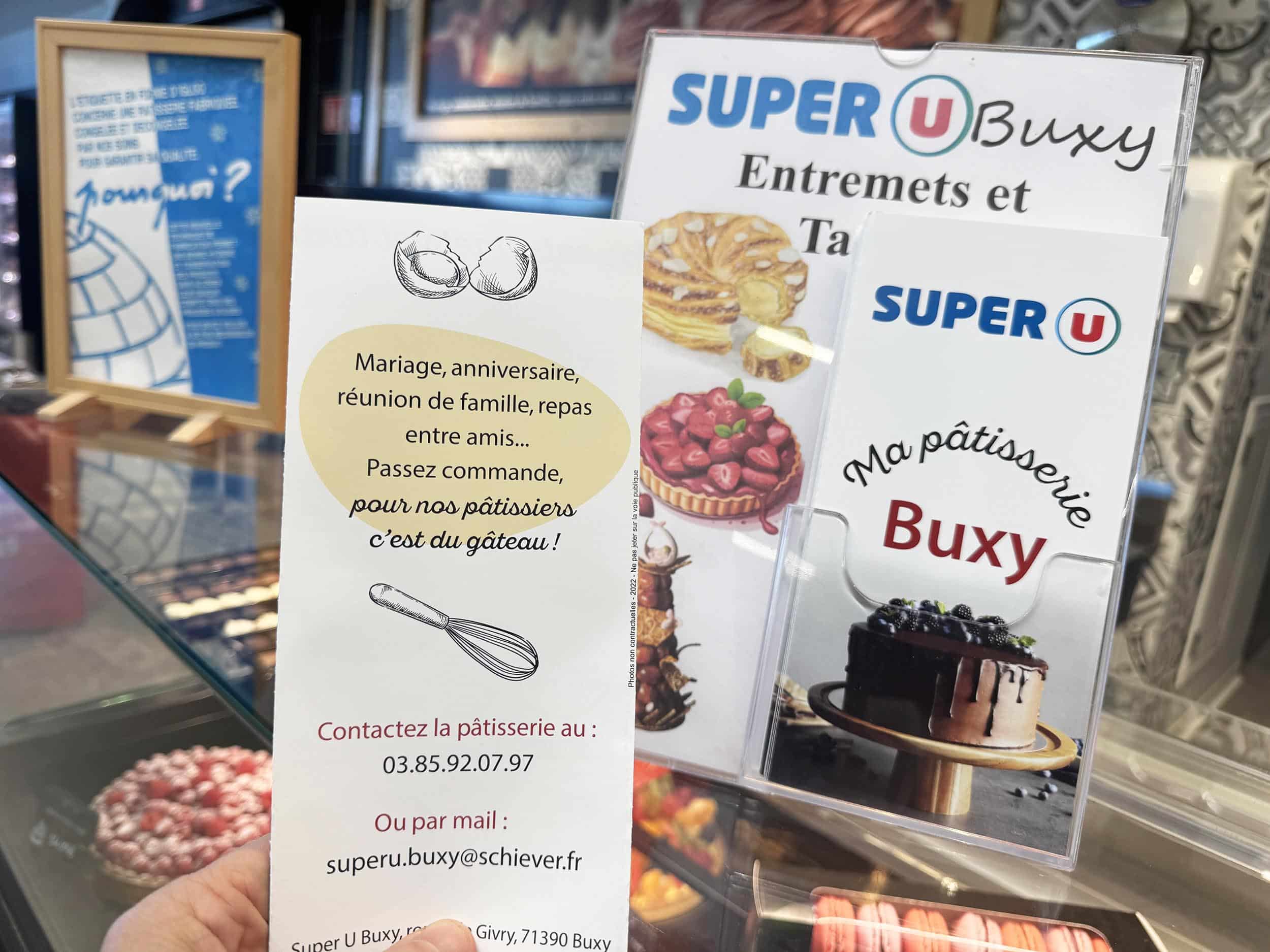 Super U Buxy (71). « Mariage, anniversaire, etc., passez commande ! Pour nos pâtissiers, c’est du gâteau ». Je me marre.