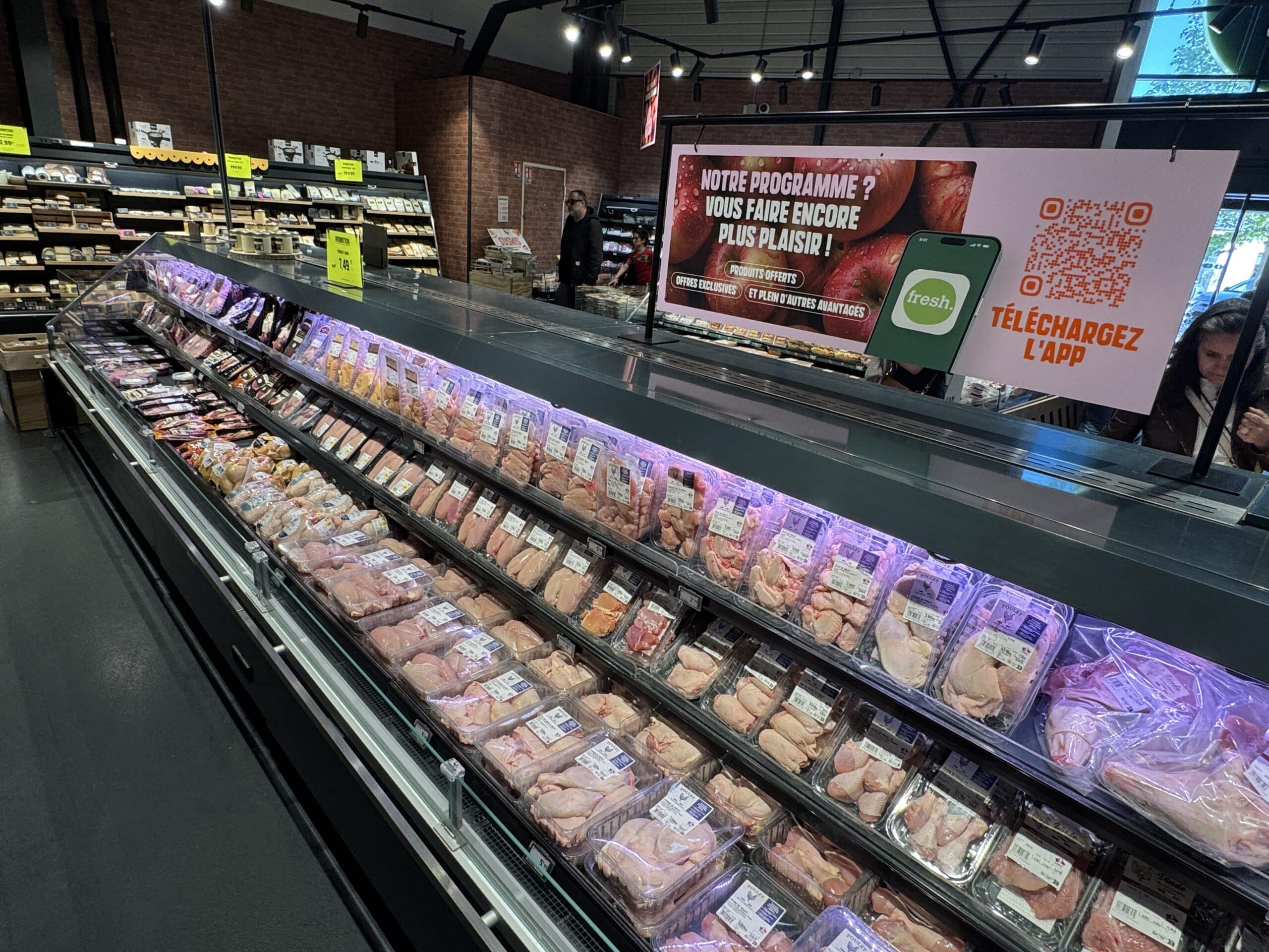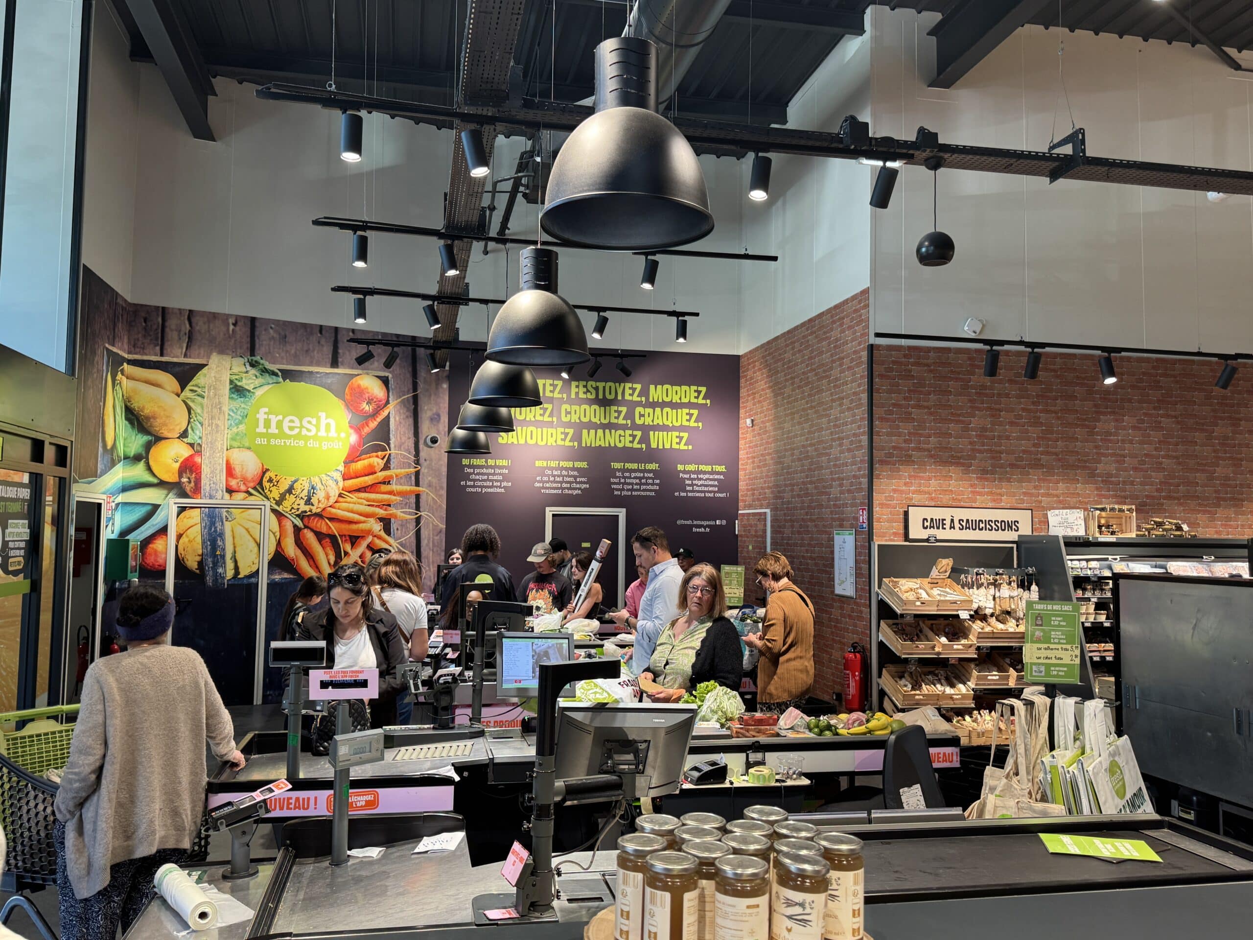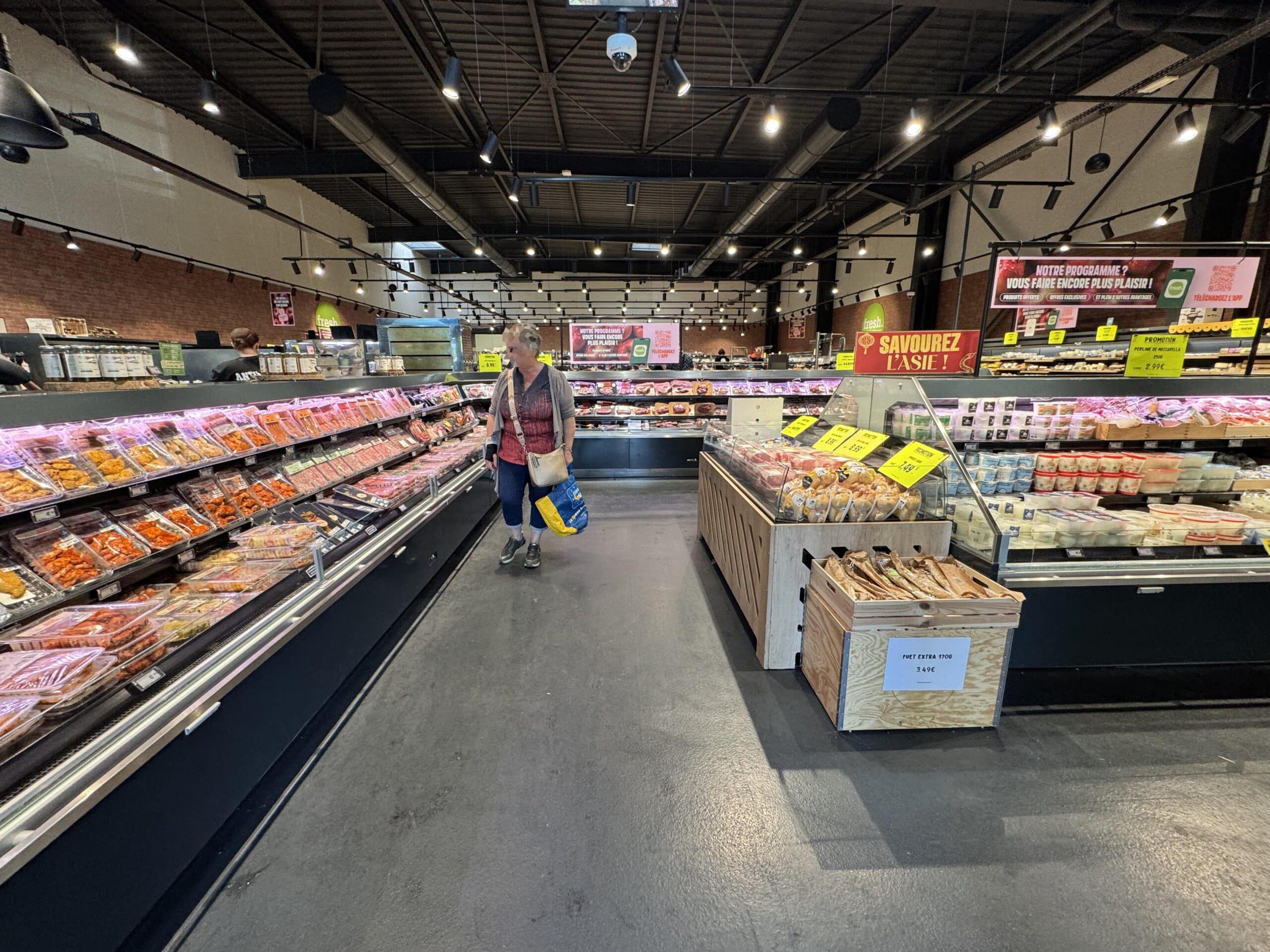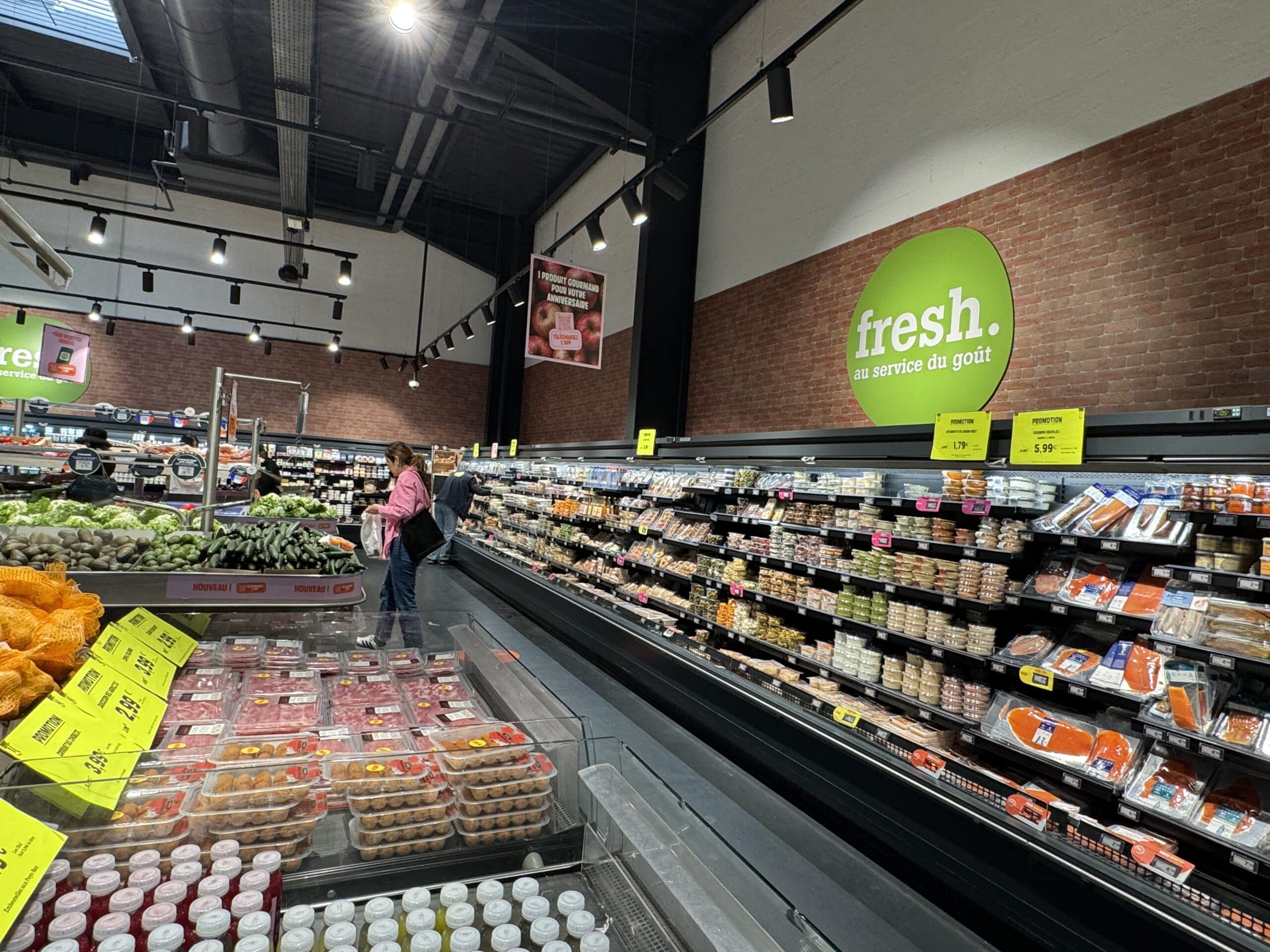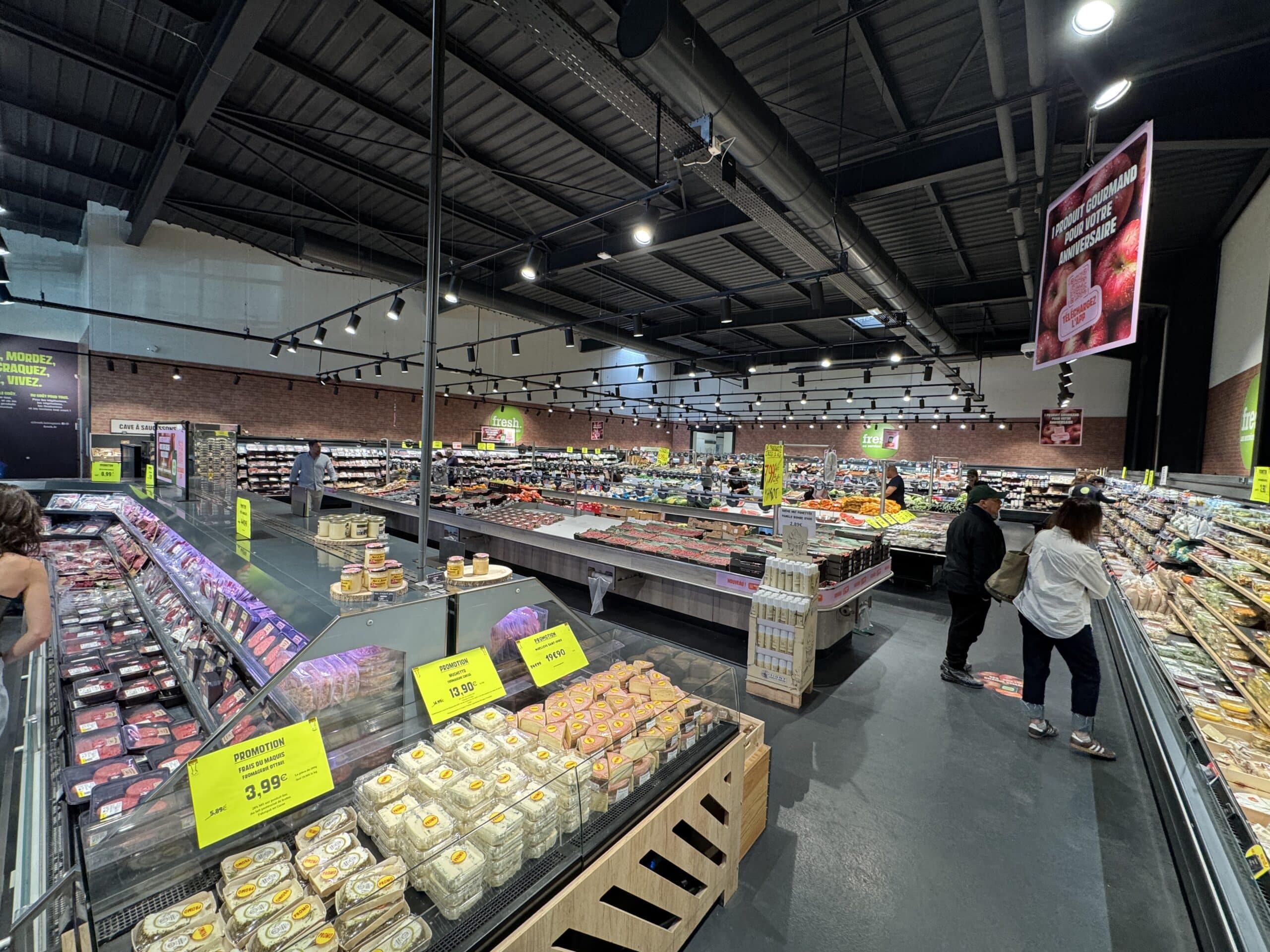 Fresh est le format de mini-multifrais de Prosol (par ailleurs opérateur de Grand Frais). Lorsque Grand Frais jauge 1 000 m2, Fresh est deux fois plus petit : 500 m2. Mais un modèle commercial manifestement efficace… La plus petite unité génère 6 millions (soit de plus de 10 K€/m2/an), la plus importante 18 millions. Et autant dire que 18 millions sur 500 m2, ça méritait le détour. Que j’ai donc fait à Annemasse, à quelques kilomètres de la Suisse, ceci expliquant aussi cela. Le panier est dopé par le pouvoir d’achat des frontaliers. Et le magasin dur à tenir pour la grosse trentaine de collaborateurs. Même si le point de vente a adopté quelques meubles habituellement dévolus à Grand Frais pour accroître la capacité linéaire, le flux est tel que le réassort quasi permanent !