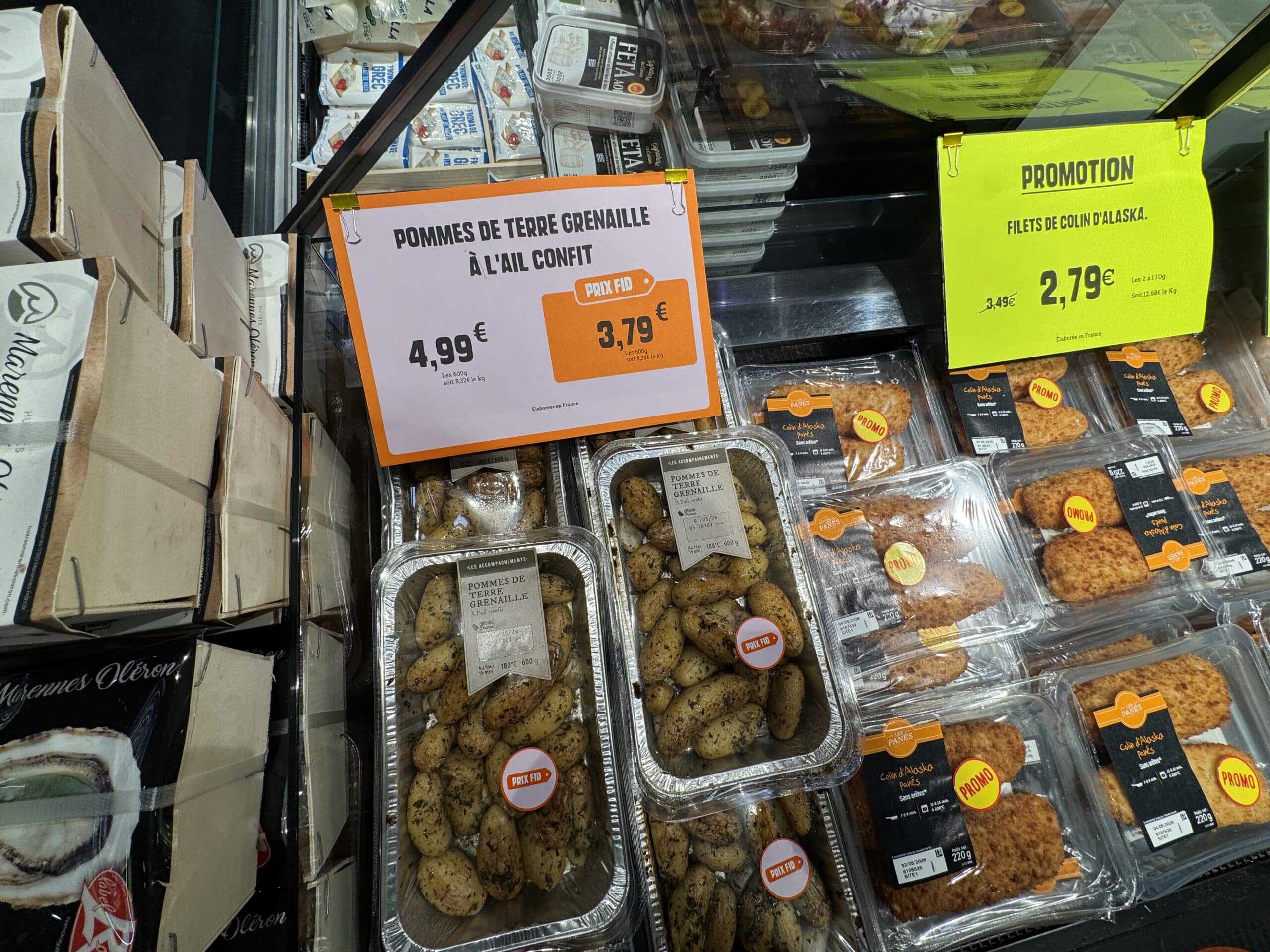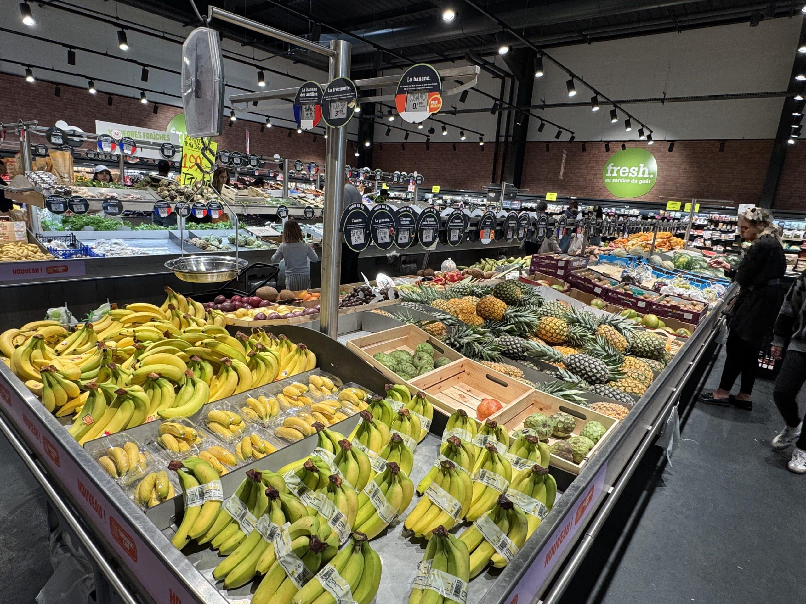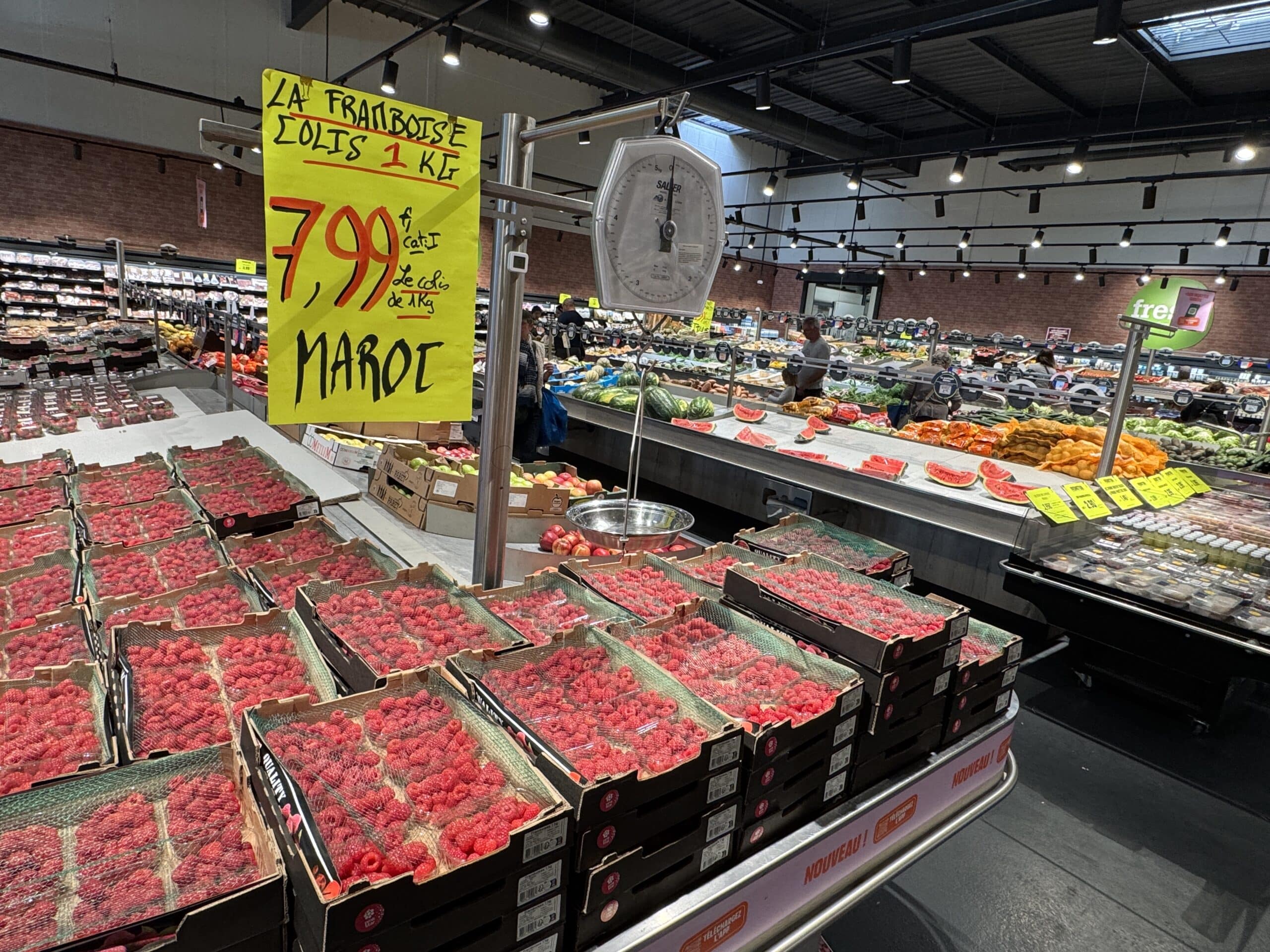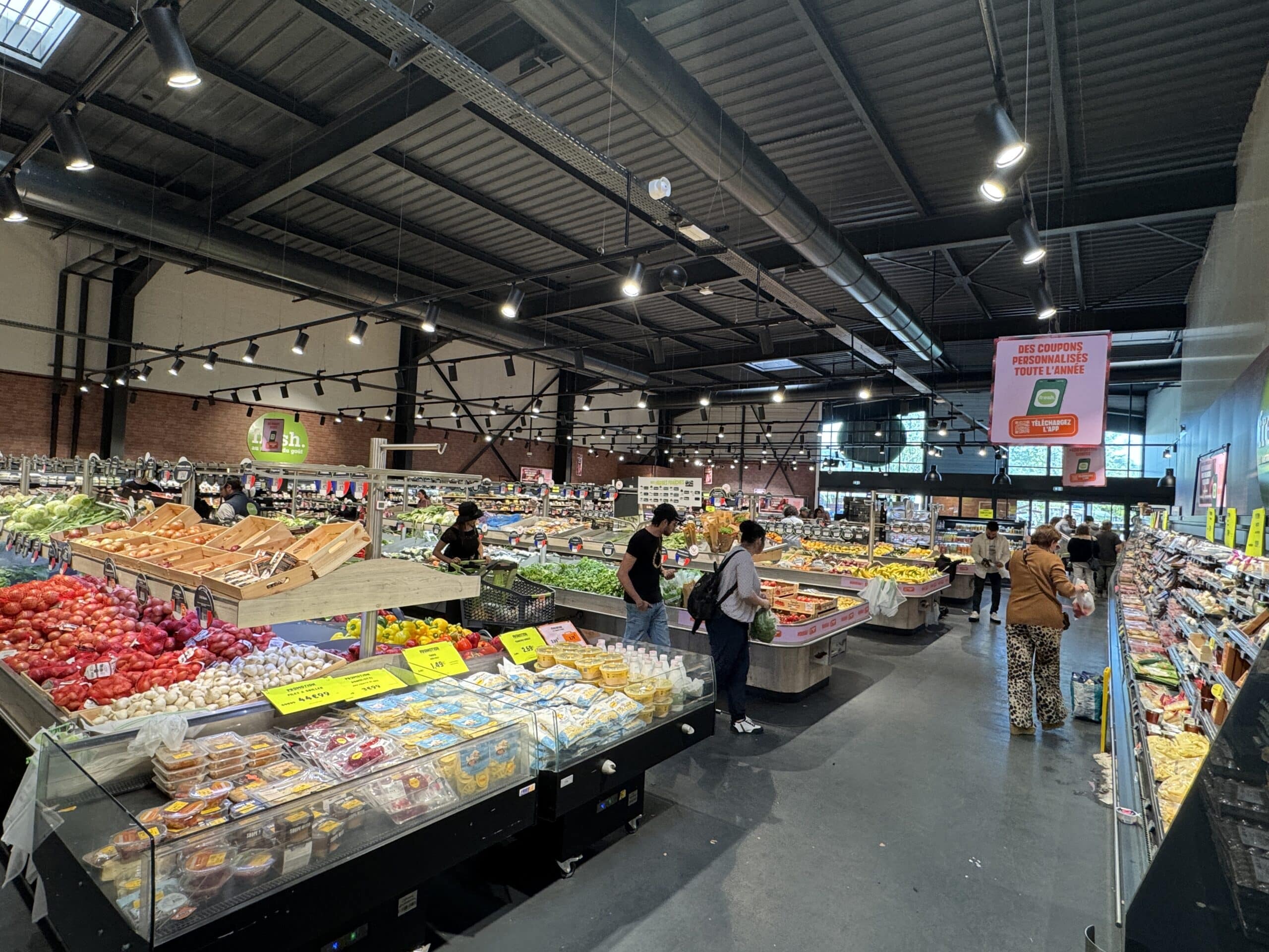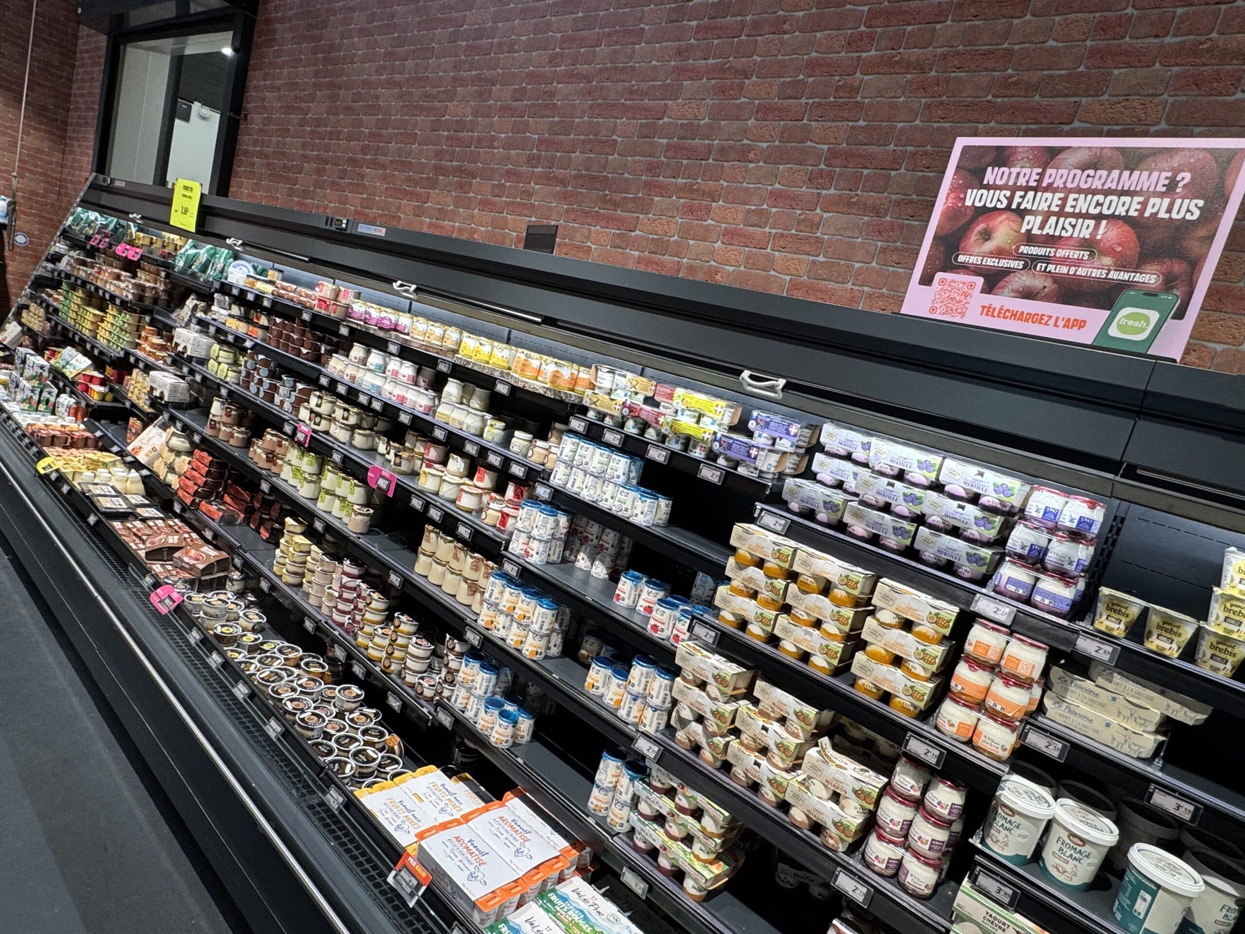 Fresh est le format de mini-multifrais de Prosol (par ailleurs opérateur de Grand Frais). Lorsque Grand Frais jauge 1 000 m2, Fresh est deux fois plus petit : 500 m2. Mais un modèle commercial manifestement efficace… La plus petite unité génère 6 millions (soit de plus de 10 K€/m2/an), la plus importante 18 millions. Et autant dire que 18 millions sur 500 m2, ça méritait le détour. Que j’ai donc fait à Annemasse, à quelques kilomètres de la Suisse, ceci expliquant aussi cela. Le panier est dopé par le pouvoir d’achat des frontaliers. Et le magasin dur à tenir pour la grosse trentaine de collaborateurs. Même si le point de vente a adopté quelques meubles habituellement dévolus à Grand Frais pour accroître la capacité linéaire, le flux est tel que le réassort quasi permanent !