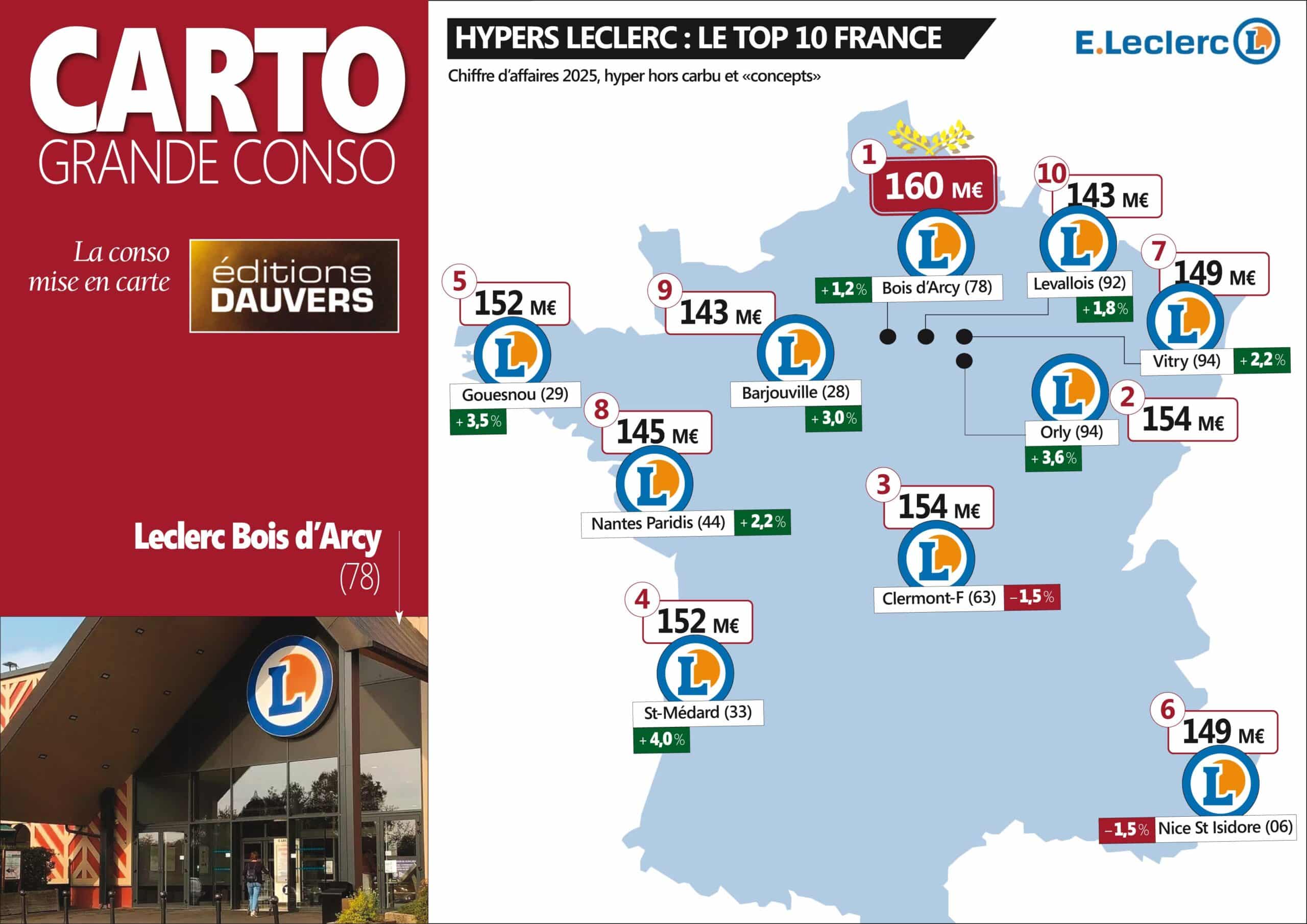Vous êtes nombreux à l’avoir demandé, le voici… Après les Top 10 Auchan et Carrefour, voici donc le Top 10 Leclerc. Tout en haut (et sans surprise), l’hyper de Bois d’Arcy avec 160 millions d’euros de CA (bien davantage en rajoutant le drive et les concepts). Au-delà, quatre hypers du…